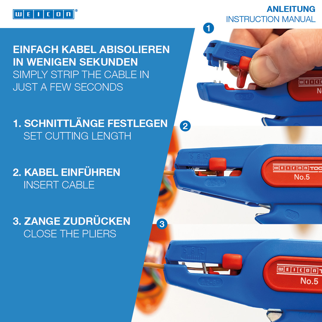 Das Arbeiten mit WEICON Abisolierwerkzeugen ist nur an potentialfreien, nicht unter Spannung stehenden Kabeln und Leitungen zulässig.