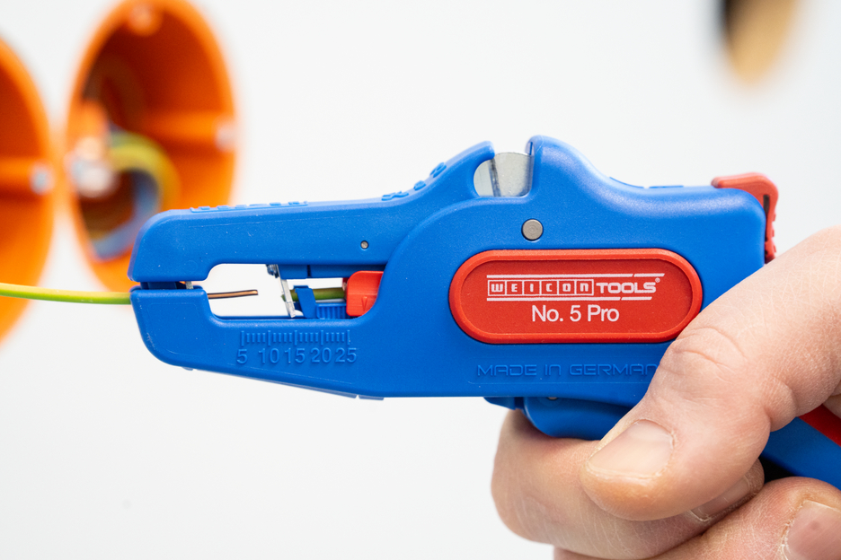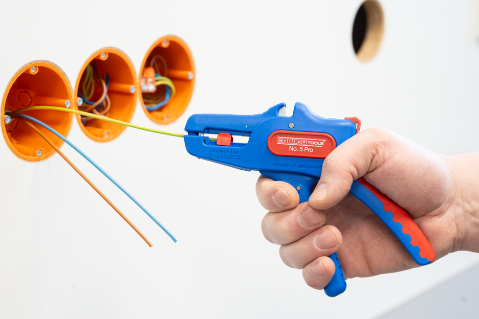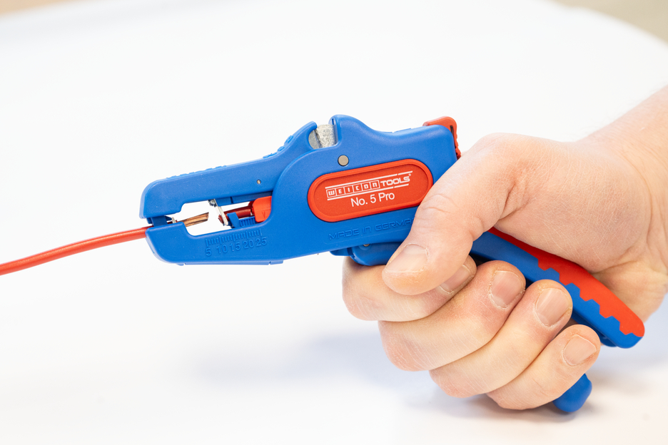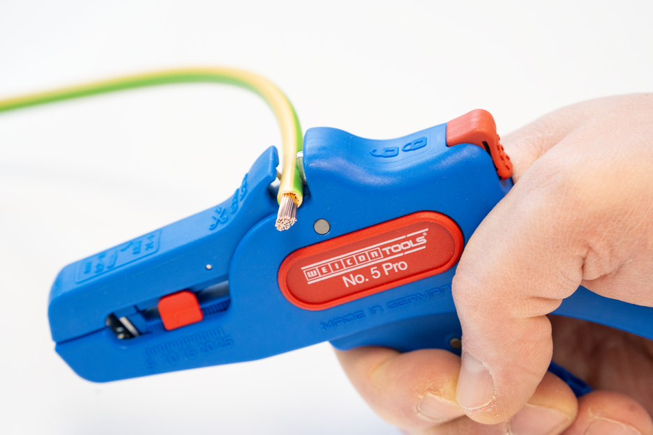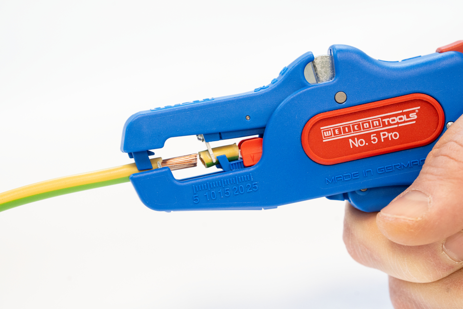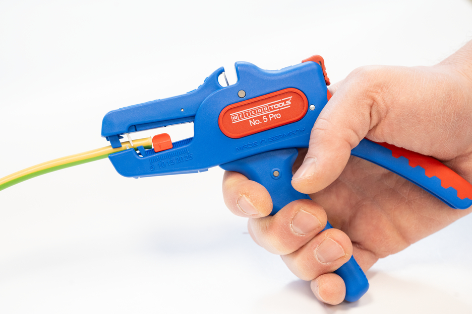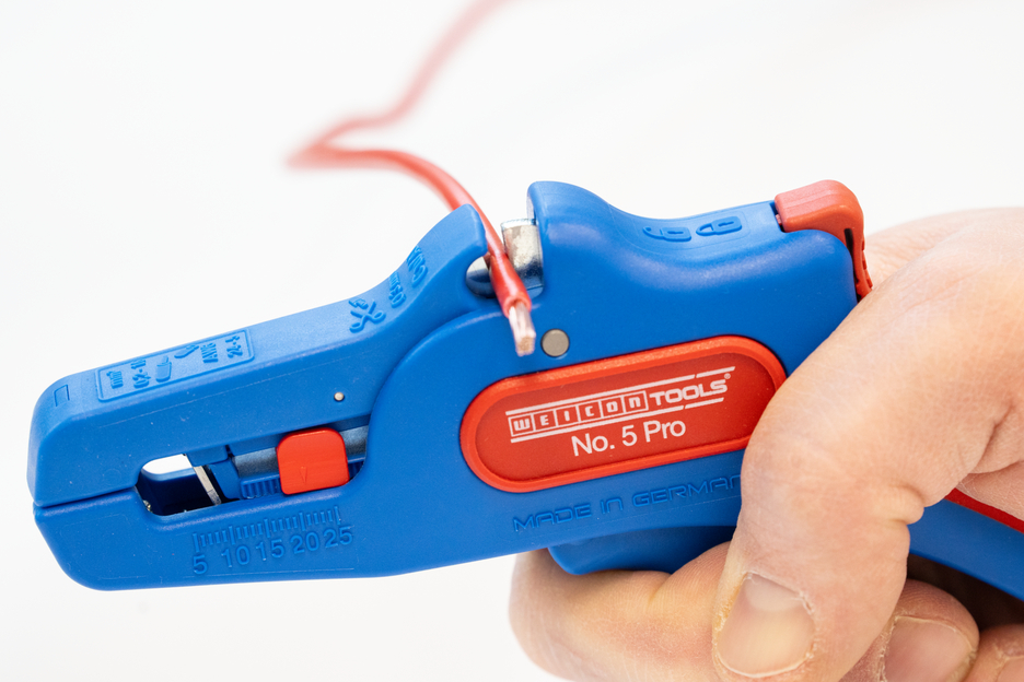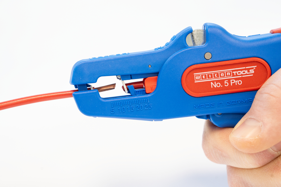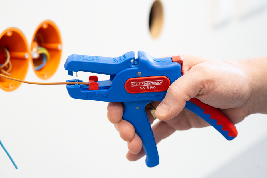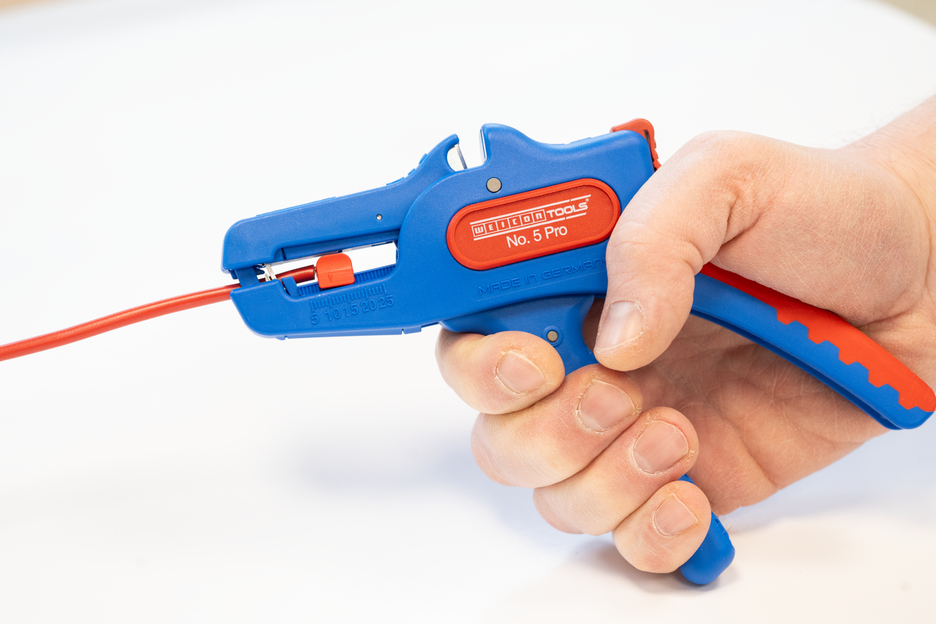 Die automatische Zange dient zum Abisolieren aller gängigen flexiblen und massiven Leiter von 0,2 bis 16 mm². Durch einen verstellbaren Längenanschlag von 5 bis 25 mm wird ein sehr präzises und genaues Arbeiten ermöglicht. Der Längenanschlag kann bei Bedarf auch herausgenommen werden. Die Zange stellt sich automatisch auf den jeweiligen Leiterquerschnitt ein – somit ist keine manuelle Einstellung erforderlich. In die Zange wurde ein Seitenschneider integriert, der sich für Leiter aus Kupfer und Aluminium bis zu einem Durchmesser von drei Millimetern eignet. Durch die schlanke Bauweise des Werkzeugs kann die Zange auch in schwer zugänglichen Arbeitsbereichen, wie beispielsweise in Schaltschränken, zum Einsatz kommen. Die Mechanik der Zange ist sehr leichtgängig und hat sich in Tests als langlebig und zuverlässig erwiesen. Die Zange verfügt über einen rutschfesten Mehrkomponenten-Griff im blau-roten „Ice-Crack“ Design. Durch die ergonomische Griffform liegt das Werkzeug gut in der Hand und gewährleistet ein ermüdungsfreies Arbeiten. Zusätzlich kann die Zange arretiert werden und lässt sich so platzsparend verstauen. Die Abisolierzange verfügt über eine Öse, an der ein Band zur Fallsicherung angebracht werden kann und wurde mit einer Beschriftungsfläche ausgestattet, um das Werkzeug individualisieren zu können.