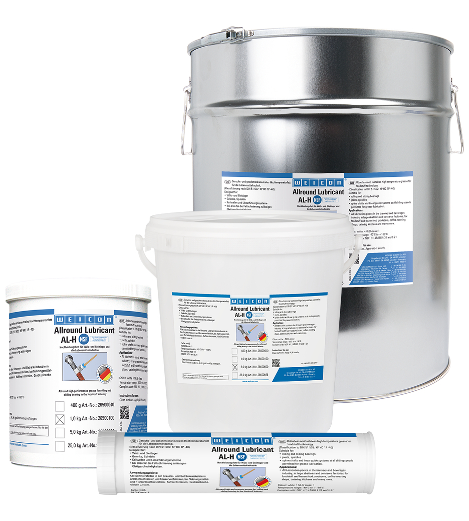WEICON AL-H ist geeignet für Wälzlager, Gleitlager, Gelenke, Spindeln, Keilwellen und Linearführungssysteme bei allen für die Fettschmierung zulässigen Gleitgeschwindigkeiten. AL-H ist besonders für einen Einsatz in der Lebensmitteltechnik geeignet.