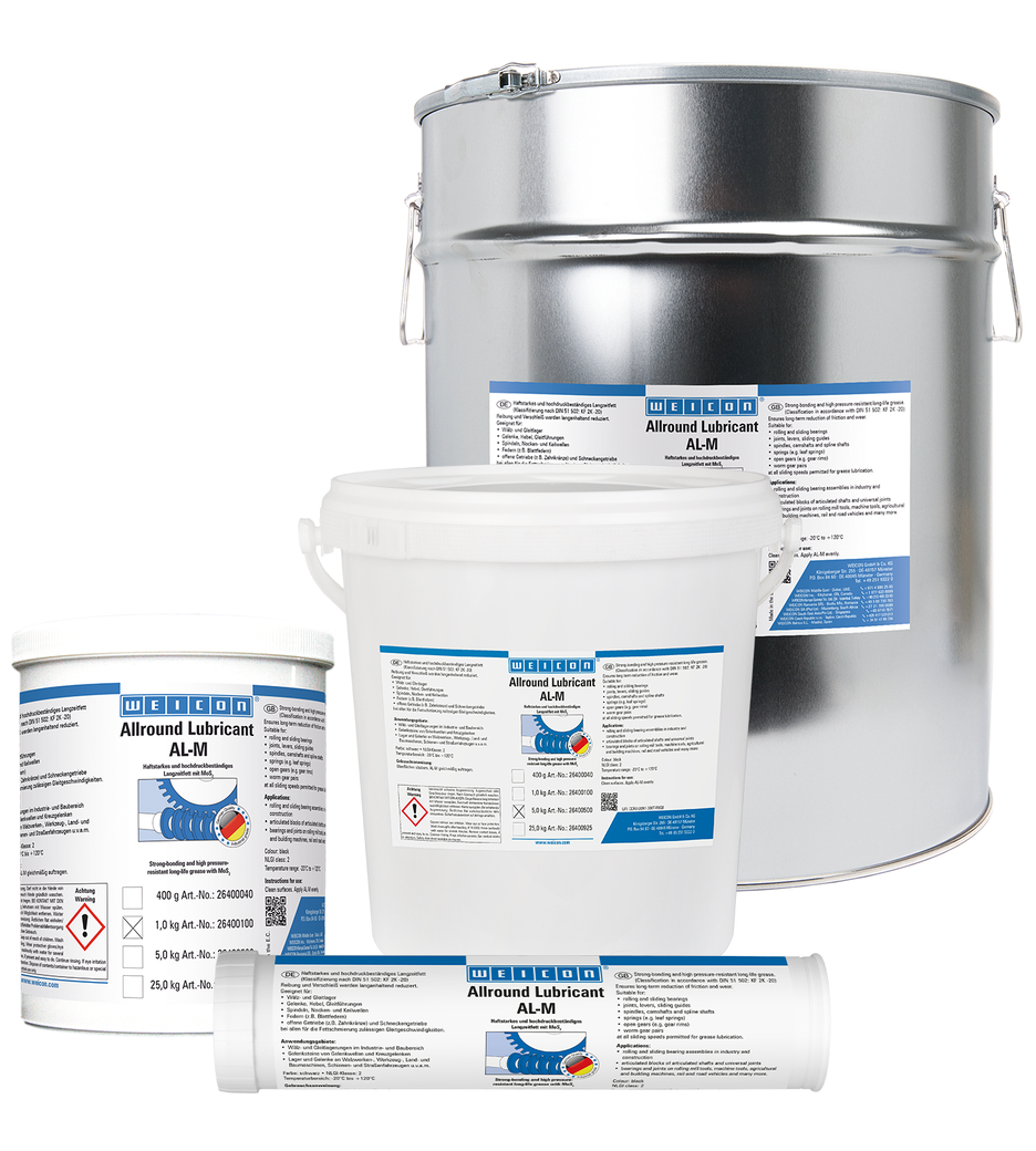 WEICON AL-M reduziert Reibung und Verschleiß langanhaltend und eignet sich für Wälz- und Gleitlager, Gelenke, Hebel, Gleitführungen, Spindeln, Nocken- und Keilwellen, Federn, offene Getriebe, Schneckengetriebe und bei allen für die Fettschmierung zulässigen Gleitgeschwindigkeiten.