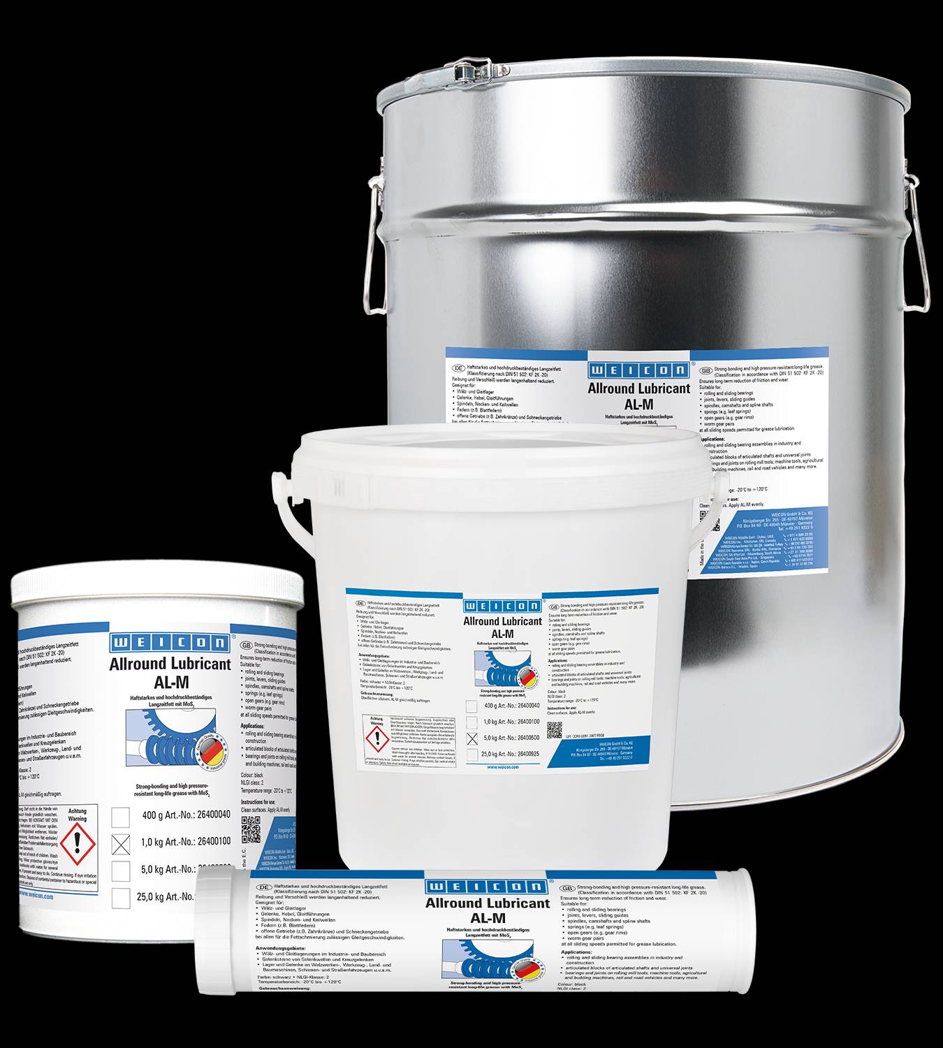 WEICON AL-M reduziert Reibung und Verschleiß langanhaltend und eignet sich für Wälz- und Gleitlager, Gelenke, Hebel, Gleitführungen, Spindeln, Nocken- und Keilwellen, Federn, offene Getriebe, Schneckengetriebe und bei allen für die Fettschmierung zulässigen Gleitgeschwindigkeiten.