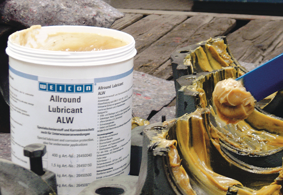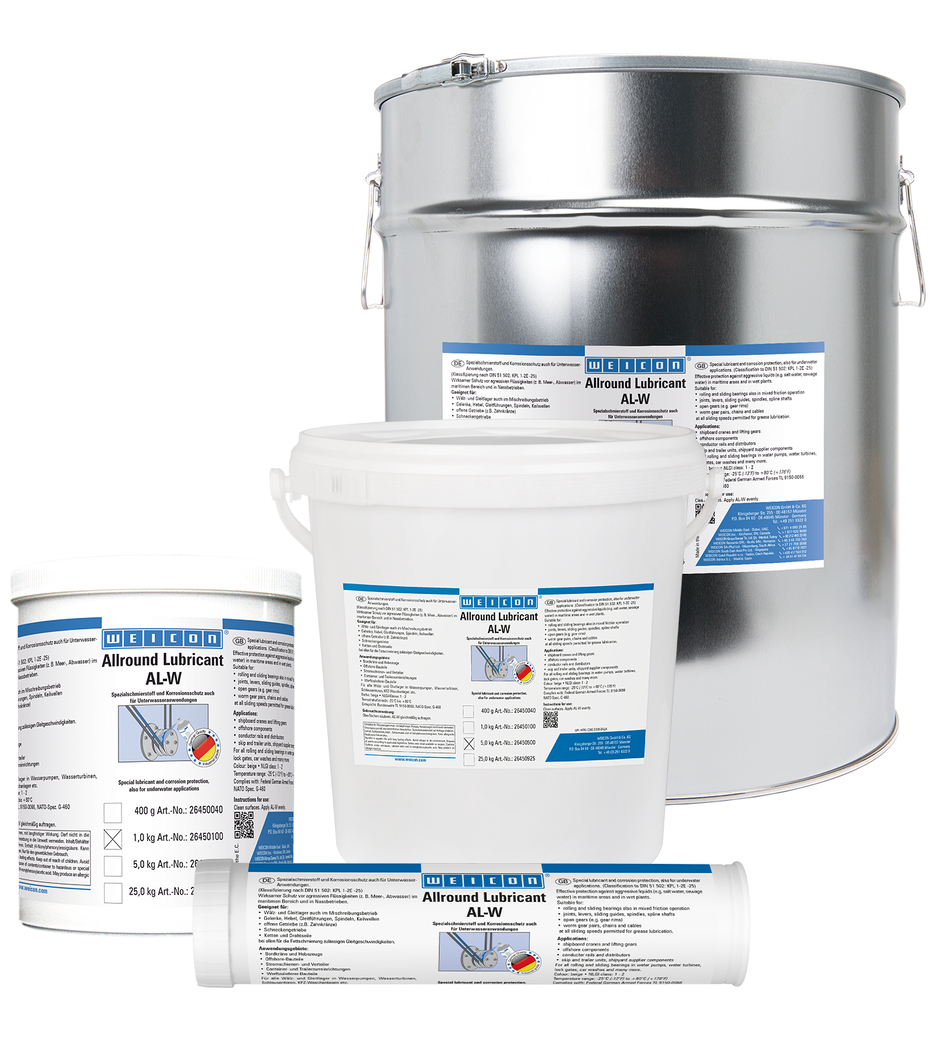 WEICON AL-W bietet wirksamen Schutz vor aggressiven Flüssigkeiten, wie Meer- oder Abwasser, sowohl im maritimen Bereich als auch in Nassbetrieben. AL-W eignet sich für Wälz- und Gleitlager auch im Mischreibungsbetrieb, Gelenke, Hebel, Gleitführungen, Spindeln, Keilwellen, offene Getriebe, Schneckengetriebe, Ketten und Drahtseile bei allen für die Fettschmierung zulässigen Gleitgeschwindigkeiten.