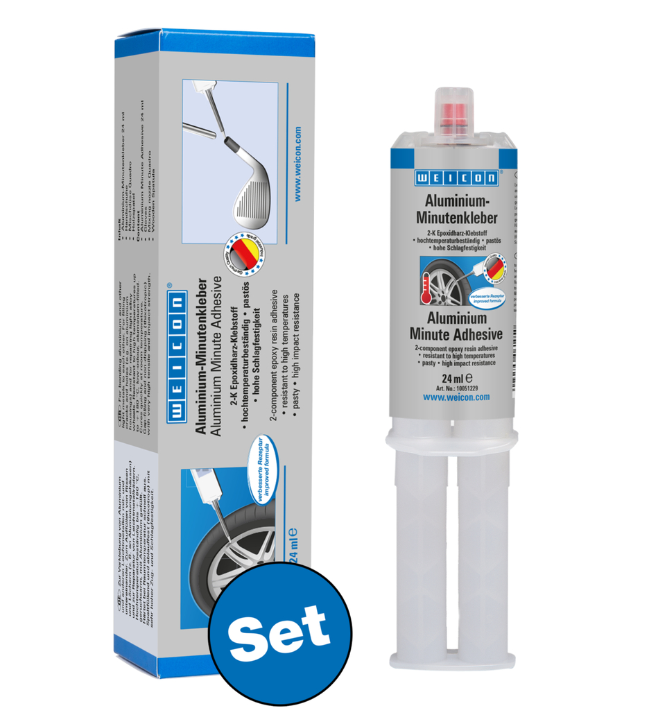 Klebstoff zur Verklebung von Aluminium und anderen Leichtmetallen mit- und untereinander. WEICON Aluminium-Minutenkleber kann zum Auffüllen von Rissen und Löchern beispielsweise an Aluminiumgehäusen dienen und zur Reparatur von Leichtmetallrädern genutzt werden. Aluminium-Minutenkleber ist ein geruchsarmer, zweikomponentiger, mit Aluminium gefüllter Epoxid-Klebstoff. Er ist hochtemperaturbeständig bis +180 °C und härtet bei Raumtemperatur schnell aus. Nach der Aushärtung kann der Klebstoff mechanisch bearbeitet (feilen, bohren, fräsen) werden. Aluminium-Minutenkleber ist spaltfüllend und ablauffest (thixotrop) und weist sehr hohe Zug- und Schlagfestigkeiten auf. Um eine optimale Haftung zu erreichen, sollten die zu verklebenden Oberflächen trocken und frei von Fett oder Schmutz sein. Das Abschaben oder Schleifen der Oberfläche vor der Reinigung hilft, um eine gute Haftung zu gewährleisten.