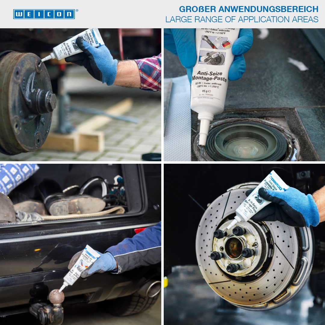WEICON Anti-Seize ist hochtemperaturbeständig und hat eine außergewöhnlich gute Trennwirkung. Anti-Seize wird als Schutz-, Trenn- und Schmierstoff für hochbeanspruchte Teile eingesetzt. Optimal aufeinander abgestimmte Feststoffanteile sowie ausgewählte Additive ermöglichen ein breites Anwendungsspektrum. Anti-Seize schützt vor Korrosion, Festfressen und Verschleiß, stick-slip-Erscheinungen, Oxidation und Passungsrost und elektrolytischen Reaktionen („Kaltverschweißen“).