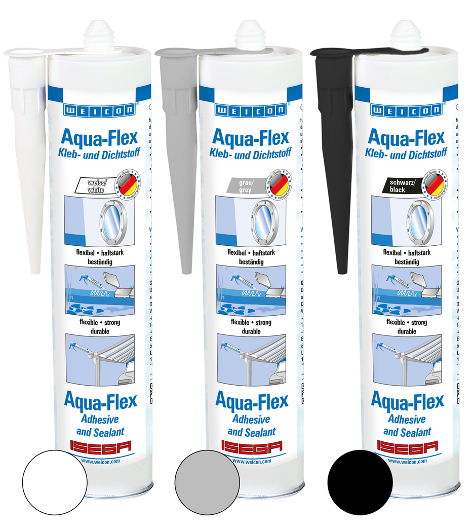 WEICON Aqua-Flex ist haftstark, „nass in nass“ überlackierbar schleiffähig, hat eine hervorragende Alterungsbeständigkeit, ist witterungsbeständig, UV-beständig, ist beständig gegenüber Süß- und Seewasser und ist silicon-, isocyanat-, halogen- und lösemittelfrei. Das Produkt ist ISEGA zertifiziert und kann als Klebstoff in der Lebensmitteltechnologie verwendet werden. Aqua-Flex ist ein elastischer Kleb- und Dichtstoff auf MS-Polymer-Basis für nasse und feuchte Untergründe und eignet sich für die Verklebung zahlreicher Materialien, wie Metall, Kunststoff, Keramik, Holz, Glas und Stein. Der Kleb- und Dichtstoff kann im Rohr- und Leitungsbau, im Behälter- und Apparatebau, in der Lüftungs- und Klimatechnik, im Garten- und Landschaftsbau, im Sanitärbereich und überall dort, wo Silicone bzw. siliconhaltige Produkte nicht geeignet sind, zum Einsatz kommen.
