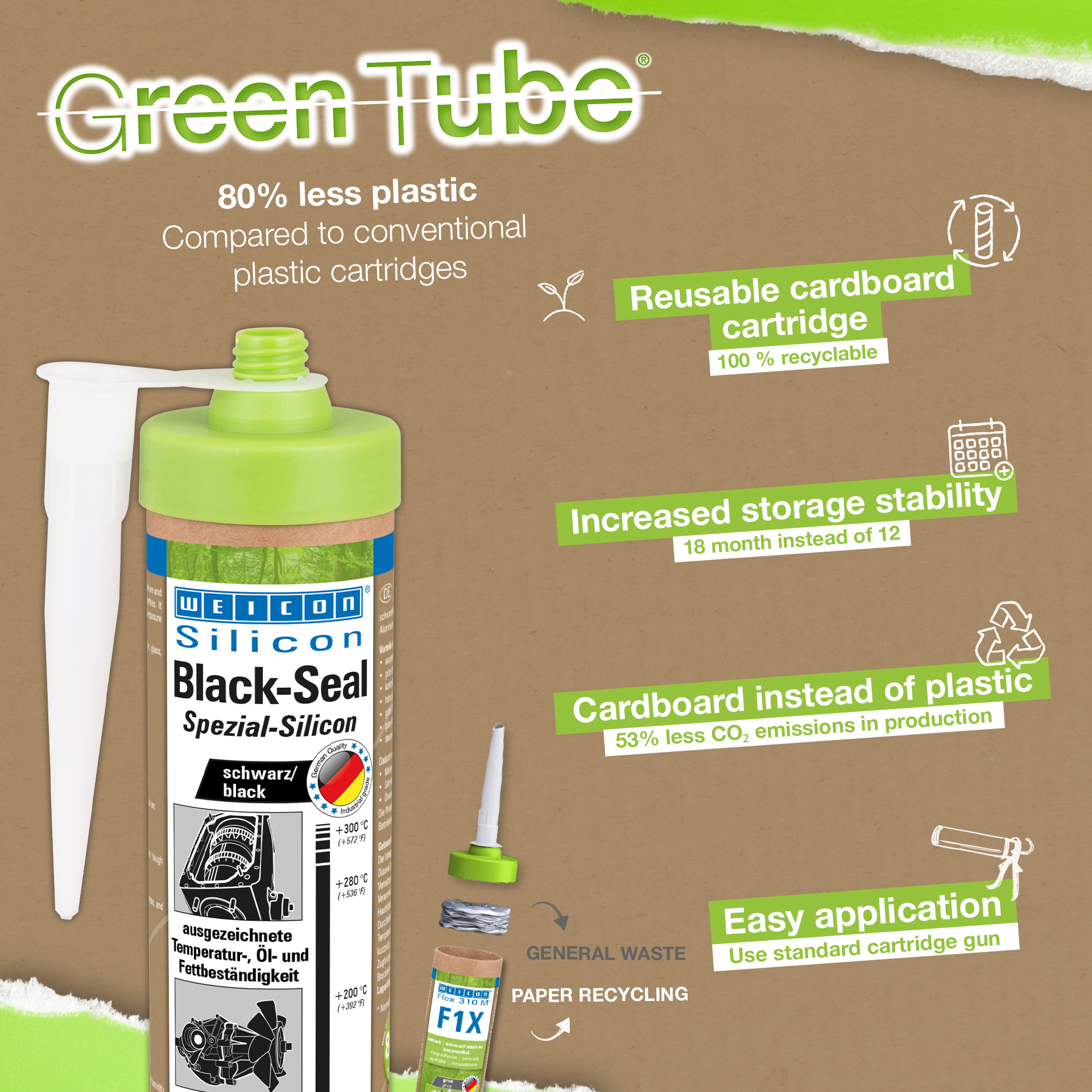 WEICON Black-Seal ist hochtemperaturbeständig (+280 °C/+536 °F), lösemittelfrei, haftstark, druckbeständig, alterungsbeständig und extrem elastisch (Bruchdehnung von ca. 500%). Es eignet sich für Verklebungen und ist für Abdichtungen geeignet, bei denen eine besonders hohe Öl- und Fettbeständigkeit erforderlich ist. Das Produkt kann an Getriebe-, Ventil- und Gehäusedeckeln, Ölwannen und Ölpumpen, Wasserpumpen, Getrieben und Achsen, Flanschen, Tanks und Behältern und in vielen anderen Bereichen zum Einsatz kommen.