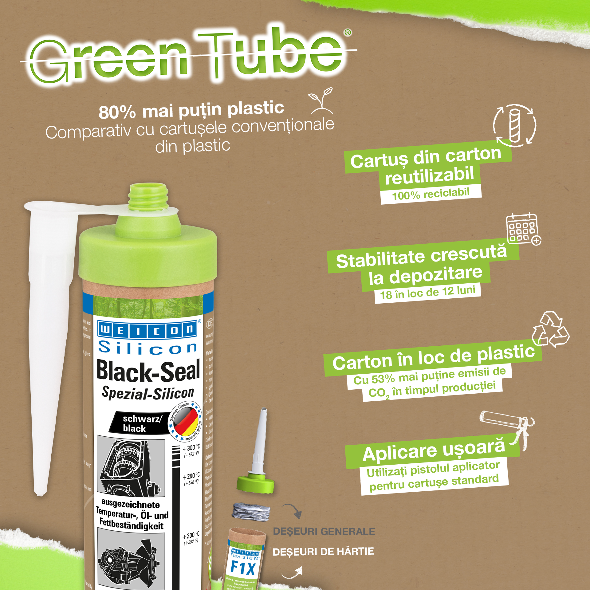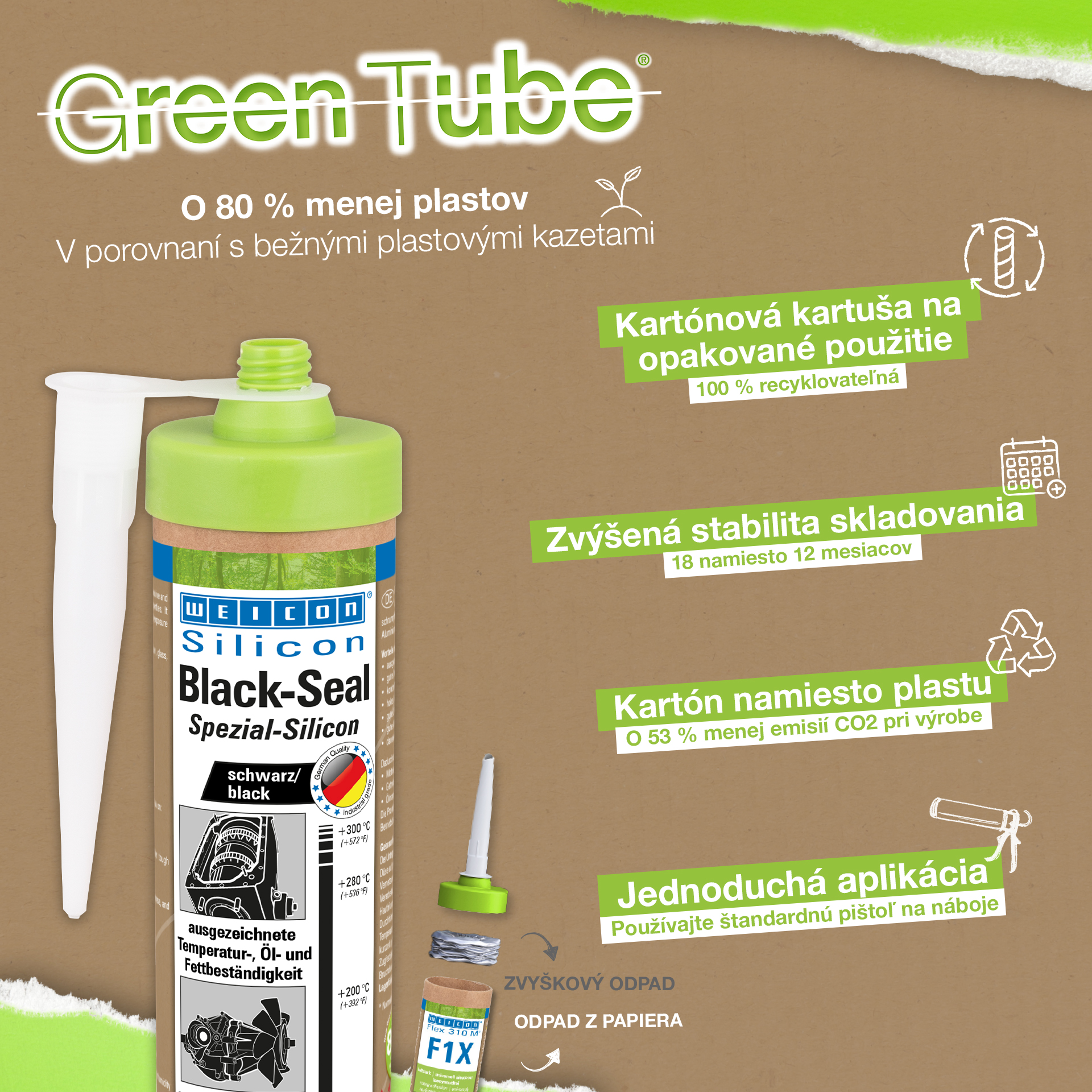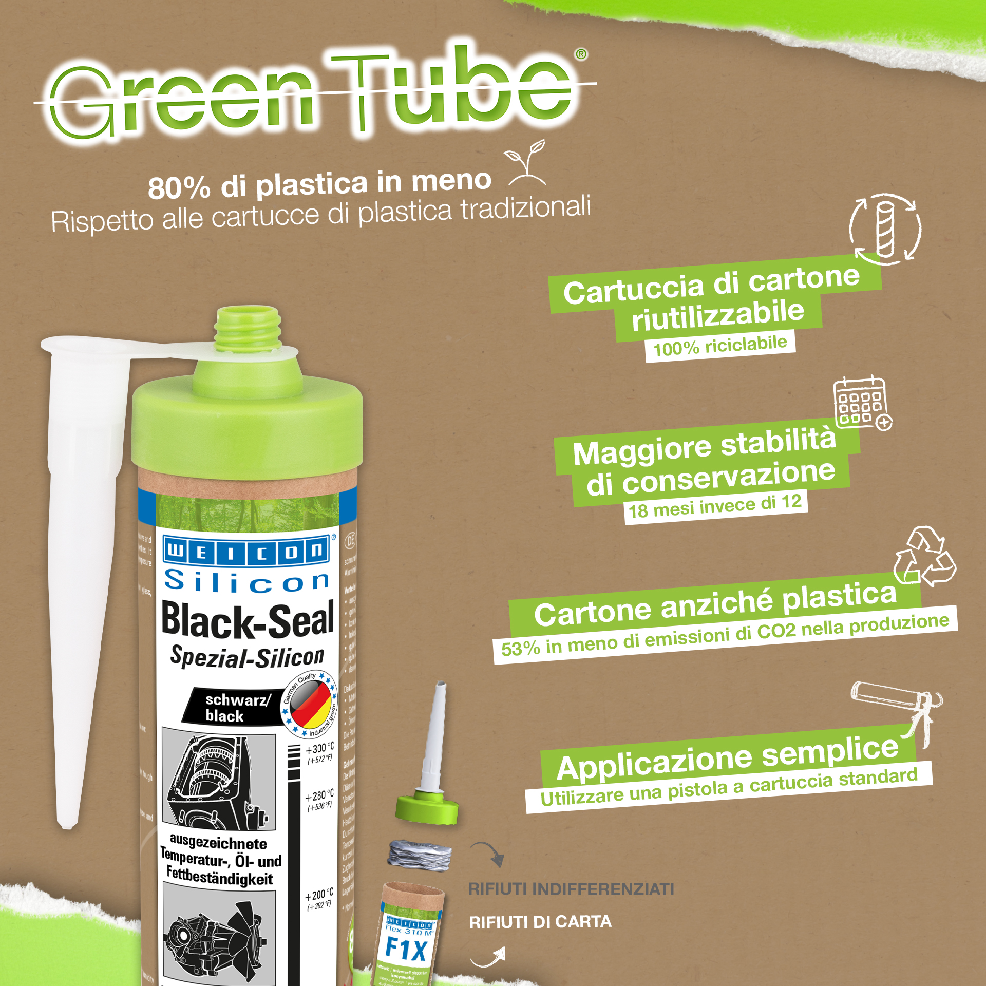 WEICON Black-Seal ist hochtemperaturbeständig (+280 °C/+536 °F), lösemittelfrei, haftstark, druckbeständig, alterungsbeständig und extrem elastisch (Bruchdehnung von ca. 500%). Es eignet sich für Verklebungen und ist für Abdichtungen geeignet, bei denen eine besonders hohe Öl- und Fettbeständigkeit erforderlich ist. Das Produkt kann an Getriebe-, Ventil- und Gehäusedeckeln, Ölwannen und Ölpumpen, Wasserpumpen, Getrieben und Achsen, Flanschen, Tanks und Behältern und in vielen anderen Bereichen zum Einsatz kommen.