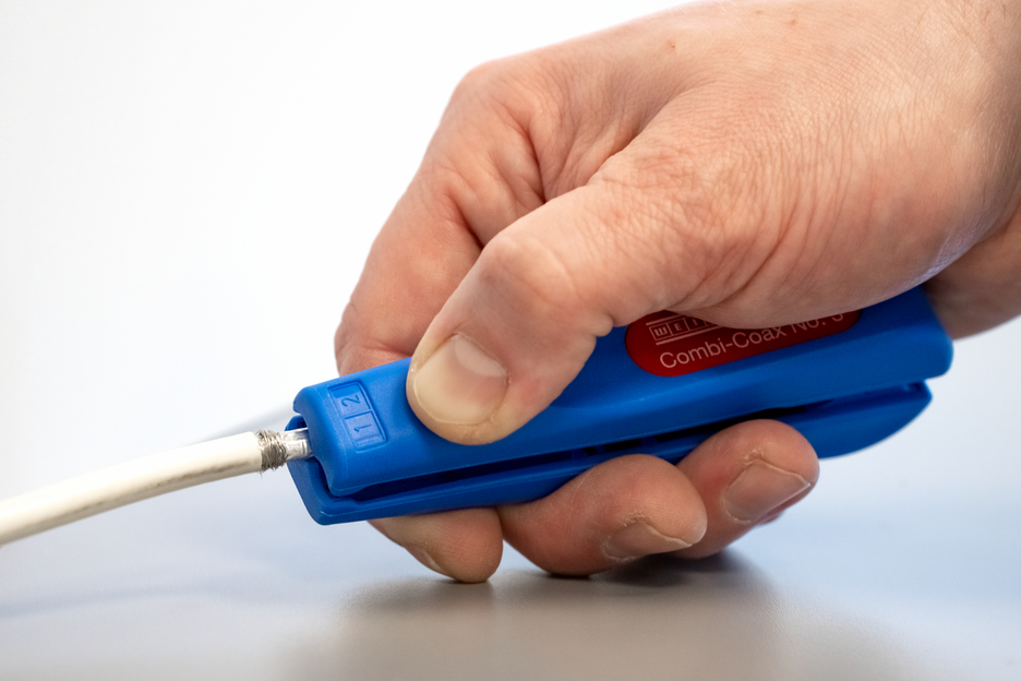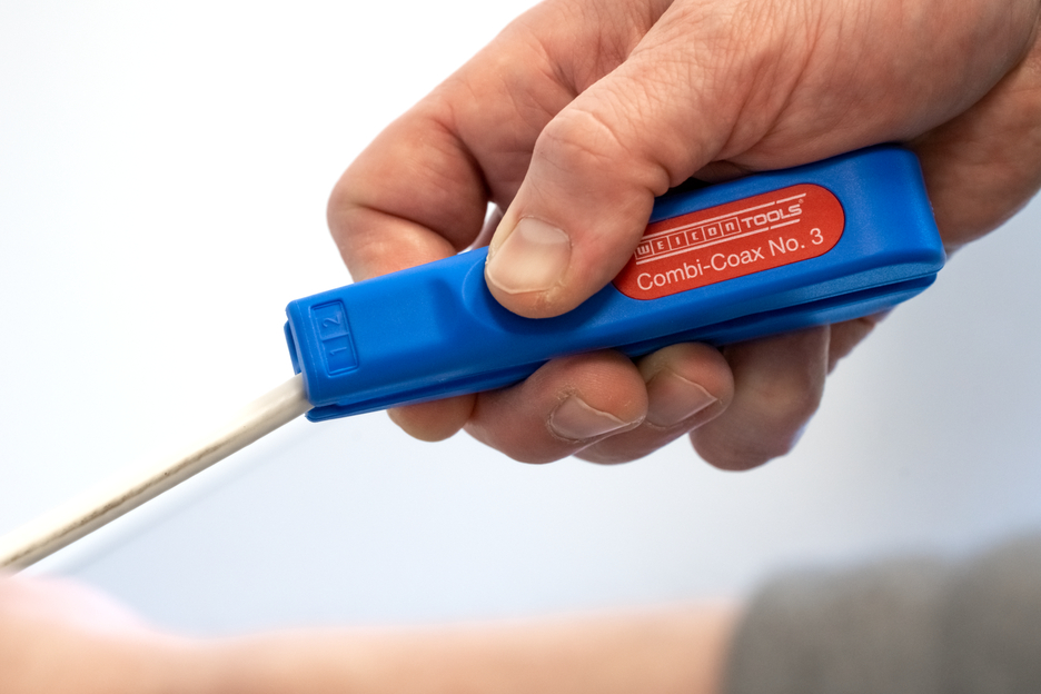 Arbeitsbereich 4,8 - 7,5 mm Ø Auch für flexible Kabel geeignet Integrierter und gut zugänglicher Seitenschneider bis 8 mm Ø Stufenweises Abisolieren aller gängigen Coaxial-Kabel