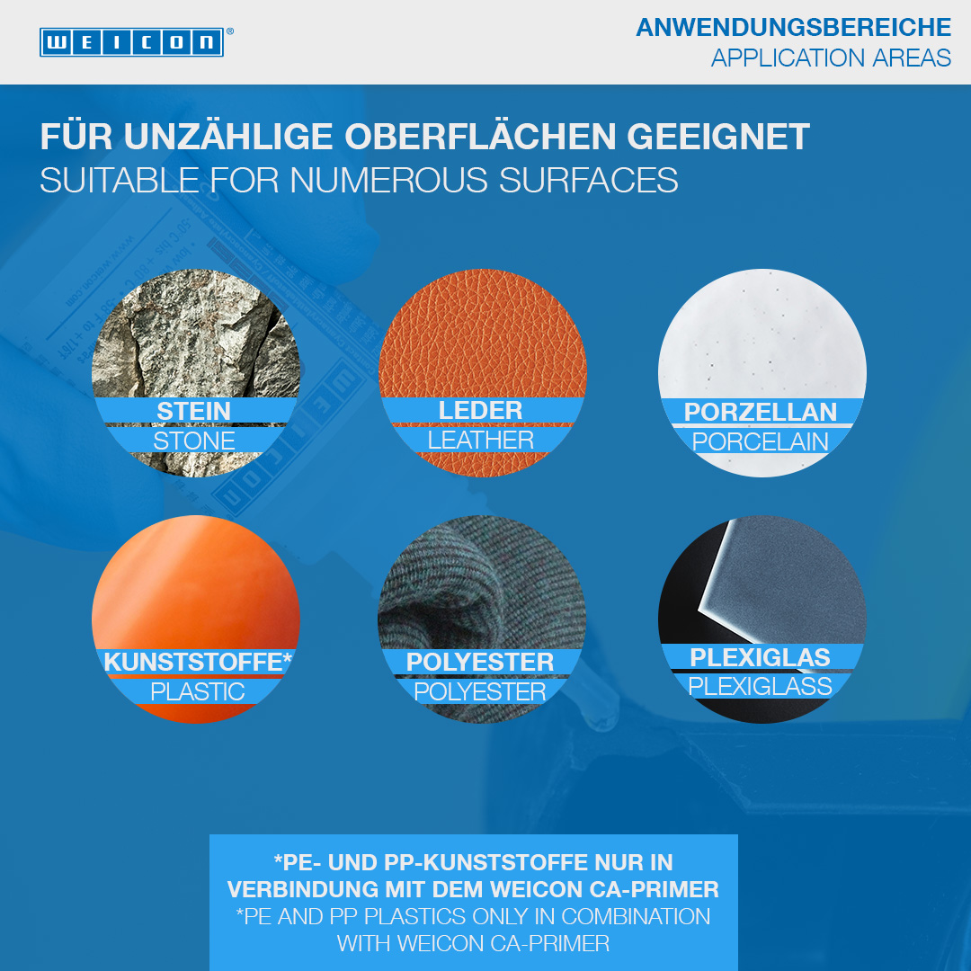WEICON Contact VA 8312 eignet sich für die Verklebung von verschiedenen Gummimaterialien, wie Vollgummi oder Moosgummi, Kunststoffen und von EPDMElastomeren. In Verbindung mit WEICON CA-Primer eignet sich VA 8312 auch für Polyolefine (PE-Polyethylen, PP-Polypropylen). In Verbindung mit WEICON Contact Füller eignet sich WEICON Contact VA 8312 zum Sofort-Verkleben und Füllen von Rissen, Spalten, Löchern und Unebenheiten.