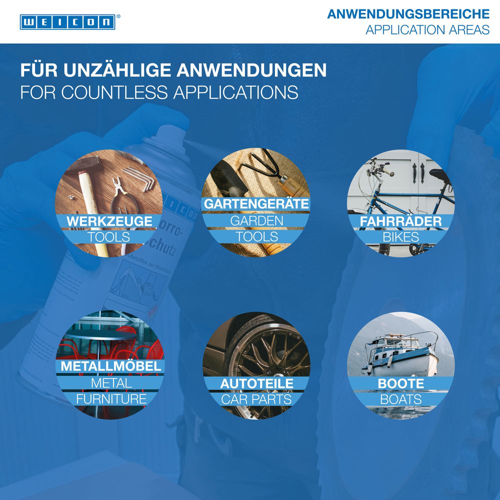 WEICON Corro-Schutz ist ein transparenter, TÜV-geprüfter Schutzfilm und konserviert Werkzeuge und Präzisionsteile aus Metall dauerhaft mit einer trockenen und wachsartigen Schicht. WEICON Corro-Schutz kann als sicherer Korrosionsschutz von blanken nicht lackierten Metallteilen, bei der Innenlagerung von Werkstücken, als Korrosionsschutz bei Überseeversand und zur Konservierung von Werkzeugen und Präzisionsteilen zum Einsatz kommen. Bei Bedarf kann der Schutzfilm leicht entfernt werden (z.B. mit WEICON Reiniger S).