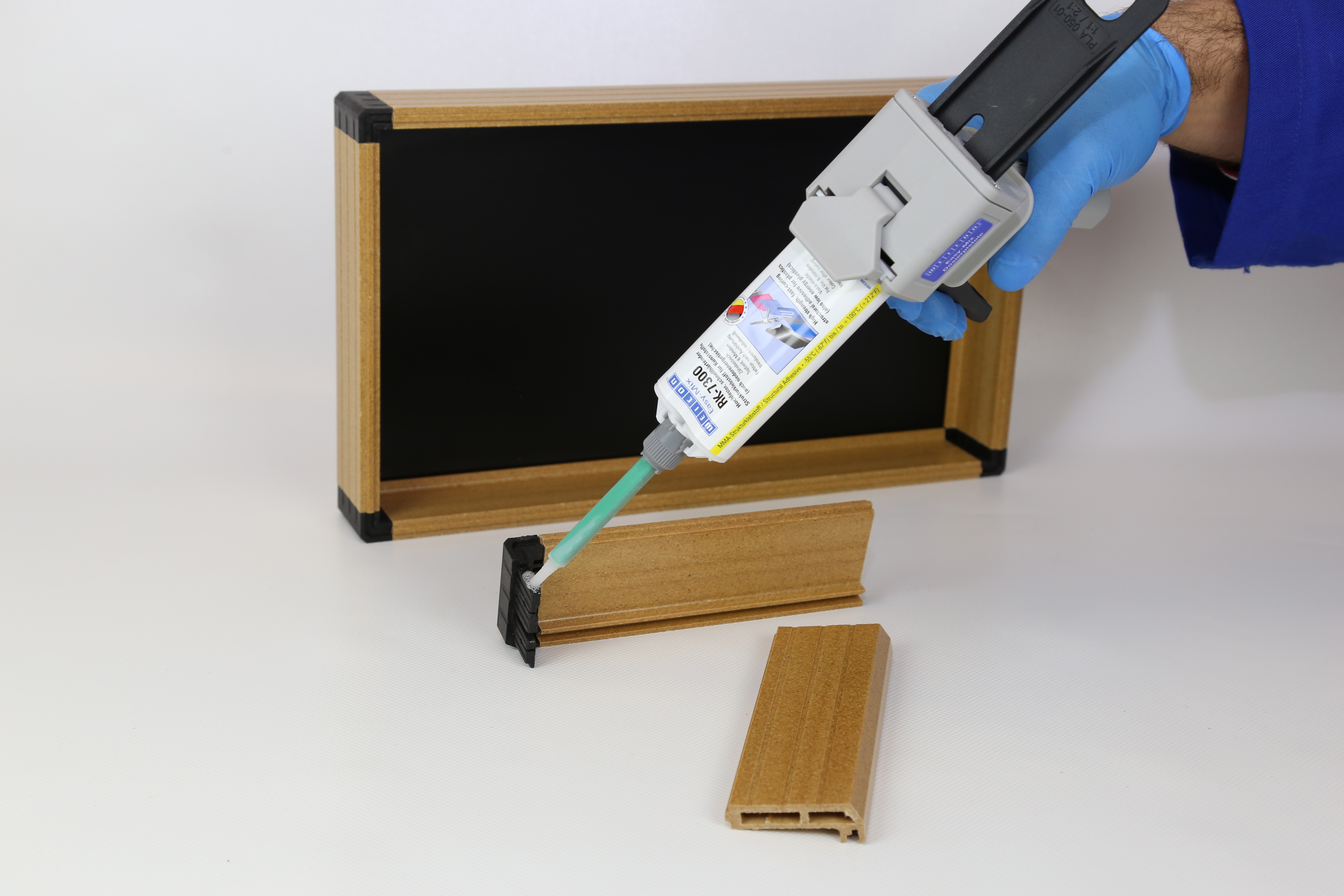 WEICON Easy-Mix RK-7300 ist ein schnellhärtender, lösemittelfreier Struktur- und Konstruktionsklebstoff auf der Basis von MMA (Methylmethacrylat). Der Klebstoff haftet sehr gut auf den verschiedensten Materialien und zeigt einen hohen Festigkeitsaufbau. Er ist universell für statische und dynamische Belastungen einsetzbar. Hochfeste Verklebungen sind auch bei niederenergetischen Kunststoffen, wie PE oder PP möglich. Seine zähelastische Einstellung erlaubt auch Materialpaarungen mit unterschiedlichen Ausdehnungskoeffizienten, wie Kunststoff / Aluminium oder Stahl. Spezielle Füllstoffe (Glaskugeln) sorgen für eine konstante Klebefuge von 0,25 mm. Maximale Spaltüberbrückung: 1 mm.