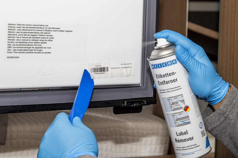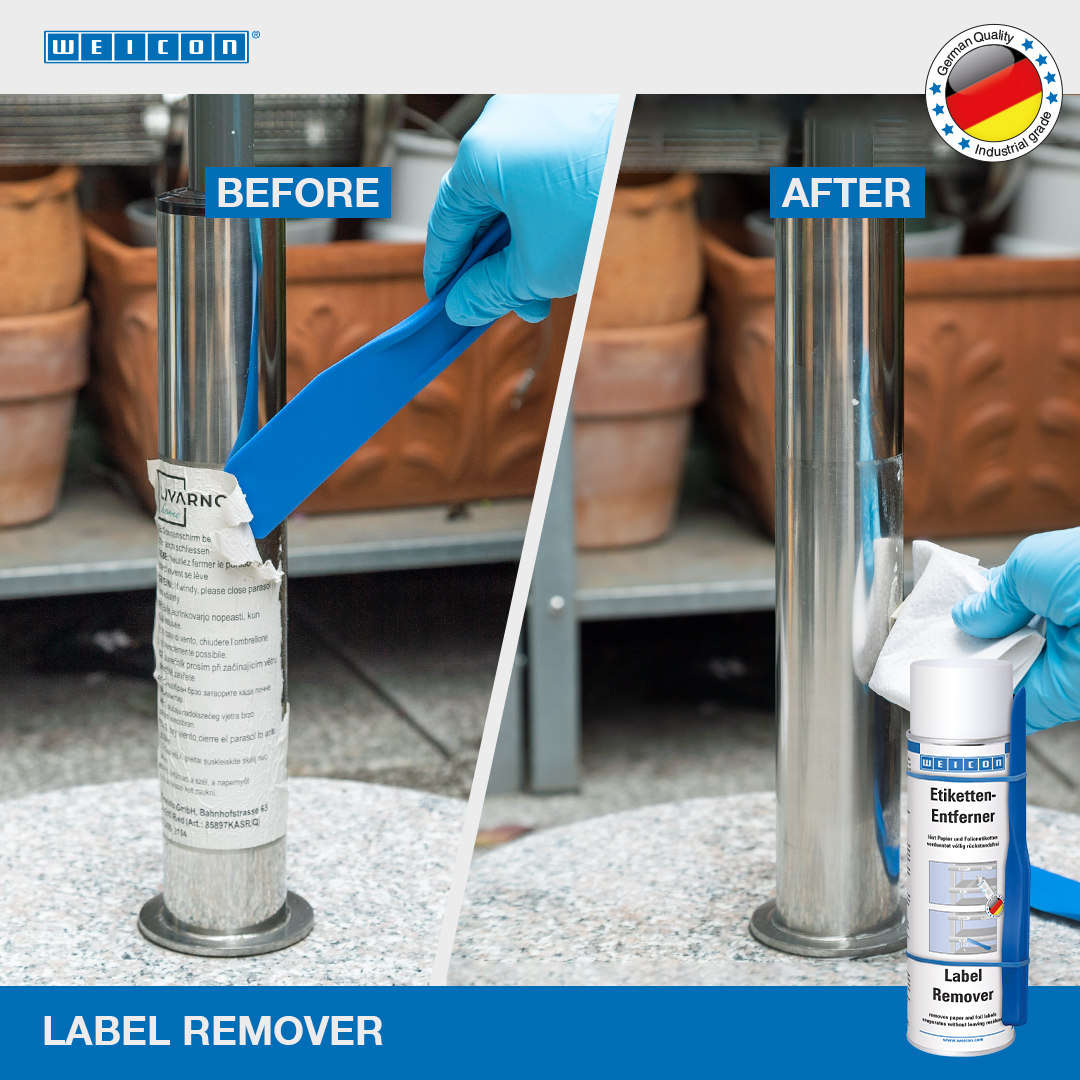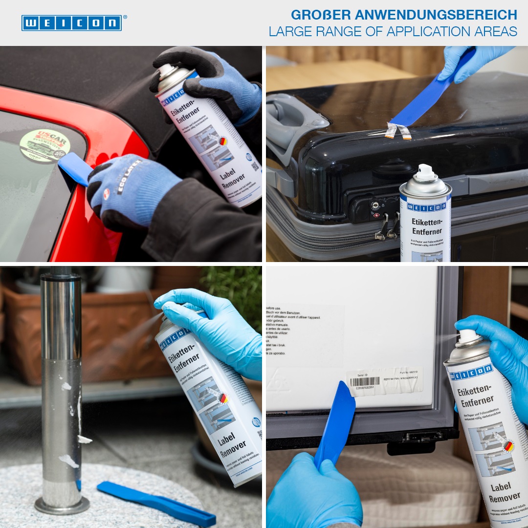 WEICON Etikettenentferner beseitigt einfach und schnell Papieretiketten und Rückstände von Haftklebstoffen auf Basis von Acrylat und Kautschuk. WEICON Etikettenentferner ist für viele Oberflächen, wie Glas, Metall, Holz, Folien und Kunststoff geeignet. Etikettenentferner beseitigt einfach und sicher Haftetiketten, entfernt Preisetiketten (z.B. Falschauszeichnungen), beseitigt Adress- und Produktaufkleber, löst Kennzeichnungsetiketten, beseitigt Etikettenreste und löst Klebstoffrückstände von Folienetiketten z.B. Vignetten an PKW-Scheiben.