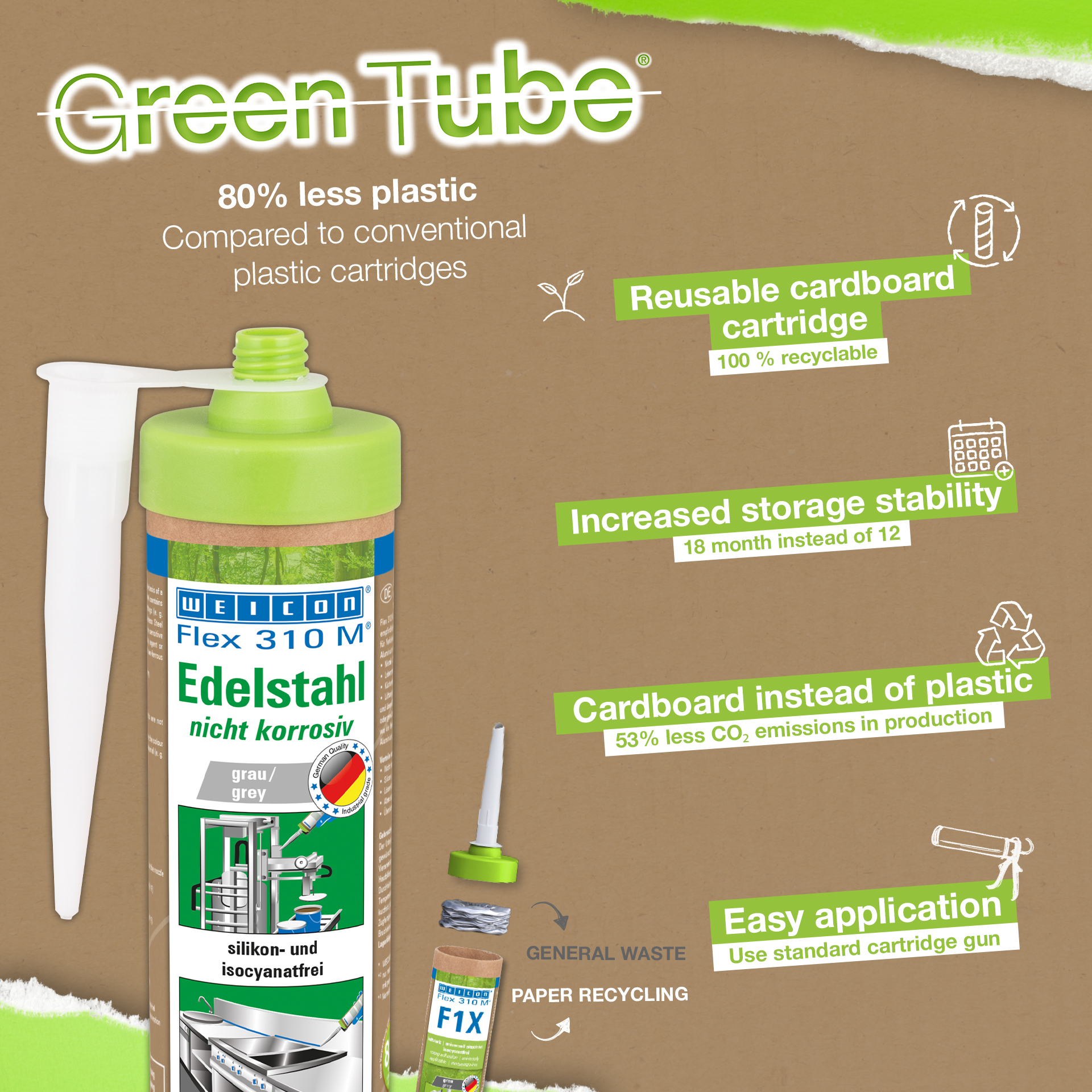 Der Kleb- und Dichtstoff WEICON Flex 310 M Edelstahl ist haftstark, „nass in nass“ überlackierbar, schleiffähig, alterungsbeständig, UV-stabil und ist silicon-, isocyanat-, halogen- und lösemittelfrei und nicht korrosiv. Das Produkt ist ISEGA zertifiziert und kann als Klebstoff in der Lebensmitteltechnologie verwendet werden. Flex 310 M Edelstahl ist ein elastischer Klebstoff auf MS-Polymer-Basis und eignet sich für Verklebungen sowie Naht- und Fugenabdichtungen an Metallen, wie Edelstahl, Aluminium und Buntmetallen. Es wird darüber hinaus auch überall dort eingesetzt, wo die Farbe des Dicht- und Klebstoffes dem Material (z.B. Edelstahl, Aluminium, etc.) angepasst sein soll. WEICON Flex 310 M Edelstahl kann im Metallbau, im Behälter- und Apparatebau, in der Lebensmittelindustrie, im Küchenbau und Sanitärbereich, in der Lüftungs- und Klimatechnik und überall dort, wo Silicone bzw. siliconhaltige Produkte nicht geeignet sind, zum Einsatz kommen.