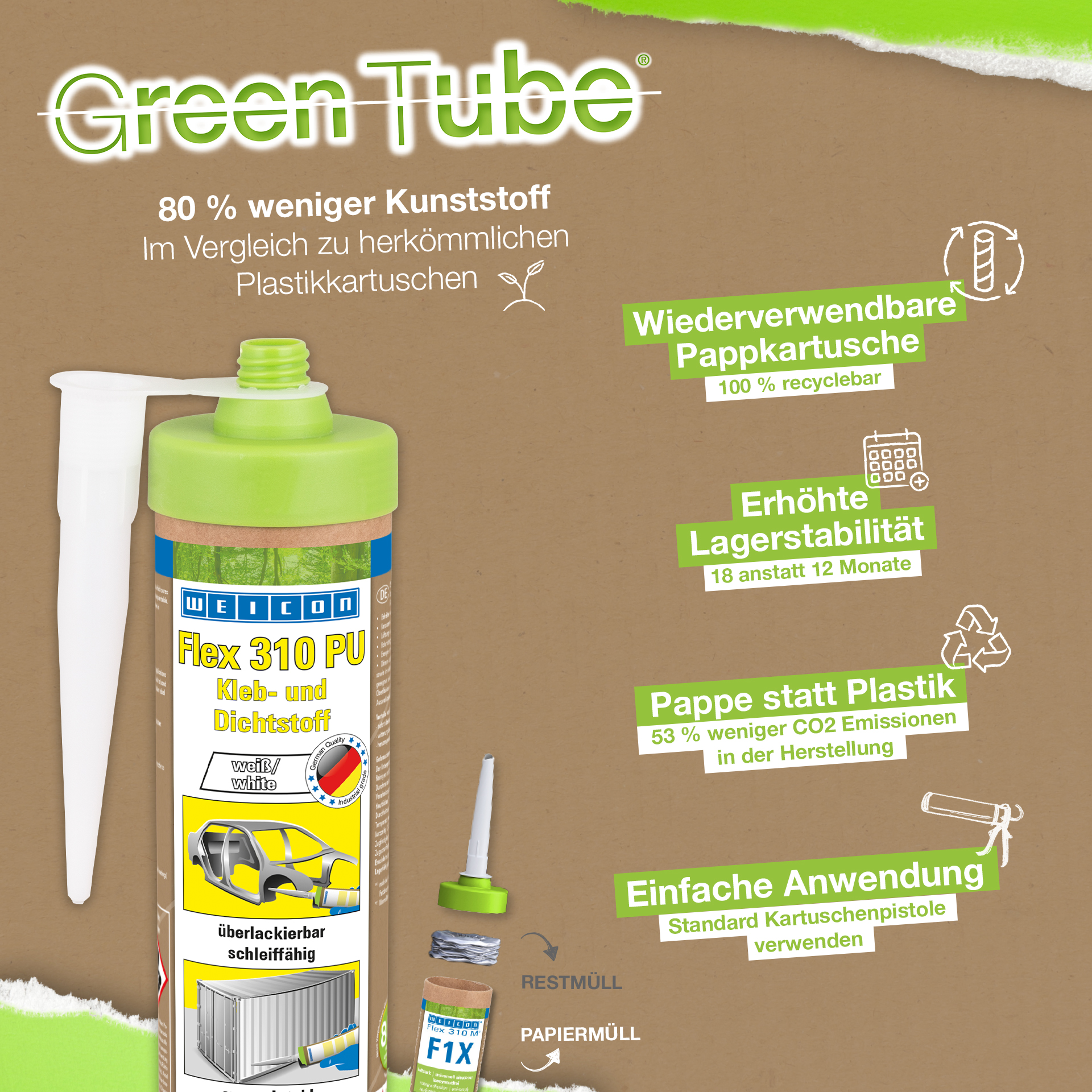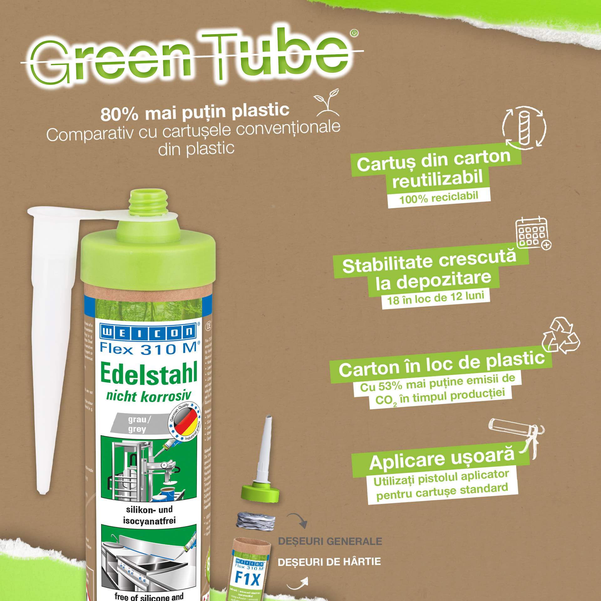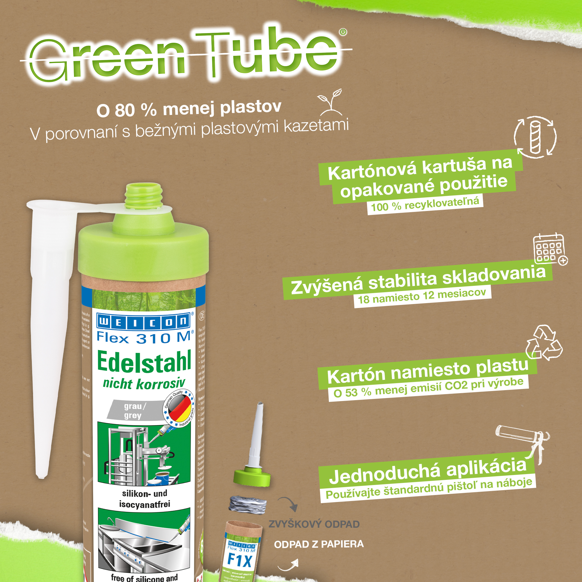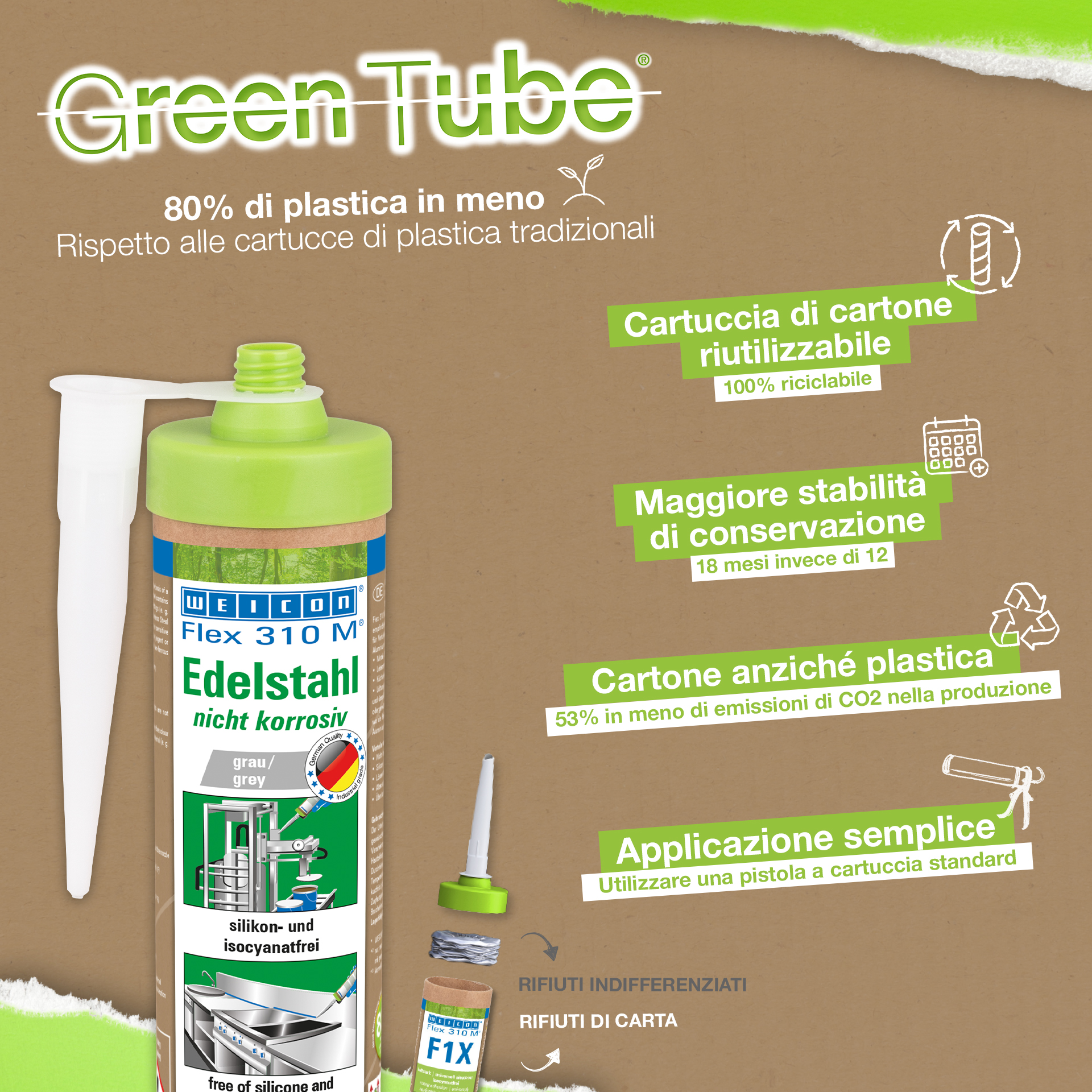 Der Kleb- und Dichtstoff WEICON Flex 310 M Edelstahl ist haftstark, „nass in nass“ überlackierbar, schleiffähig, alterungsbeständig, UV-stabil und ist silicon-, isocyanat-, halogen- und lösemittelfrei und nicht korrosiv. Das Produkt ist ISEGA zertifiziert und kann als Klebstoff in der Lebensmitteltechnologie verwendet werden. Flex 310 M Edelstahl ist ein elastischer Klebstoff auf MS-Polymer-Basis und eignet sich für Verklebungen sowie Naht- und Fugenabdichtungen an Metallen, wie Edelstahl, Aluminium und Buntmetallen. Es wird darüber hinaus auch überall dort eingesetzt, wo die Farbe des Dicht- und Klebstoffes dem Material (z.B. Edelstahl, Aluminium, etc.) angepasst sein soll. WEICON Flex 310 M Edelstahl kann im Metallbau, im Behälter- und Apparatebau, in der Lebensmittelindustrie, im Küchenbau und Sanitärbereich, in der Lüftungs- und Klimatechnik und überall dort, wo Silicone bzw. siliconhaltige Produkte nicht geeignet sind, zum Einsatz kommen.