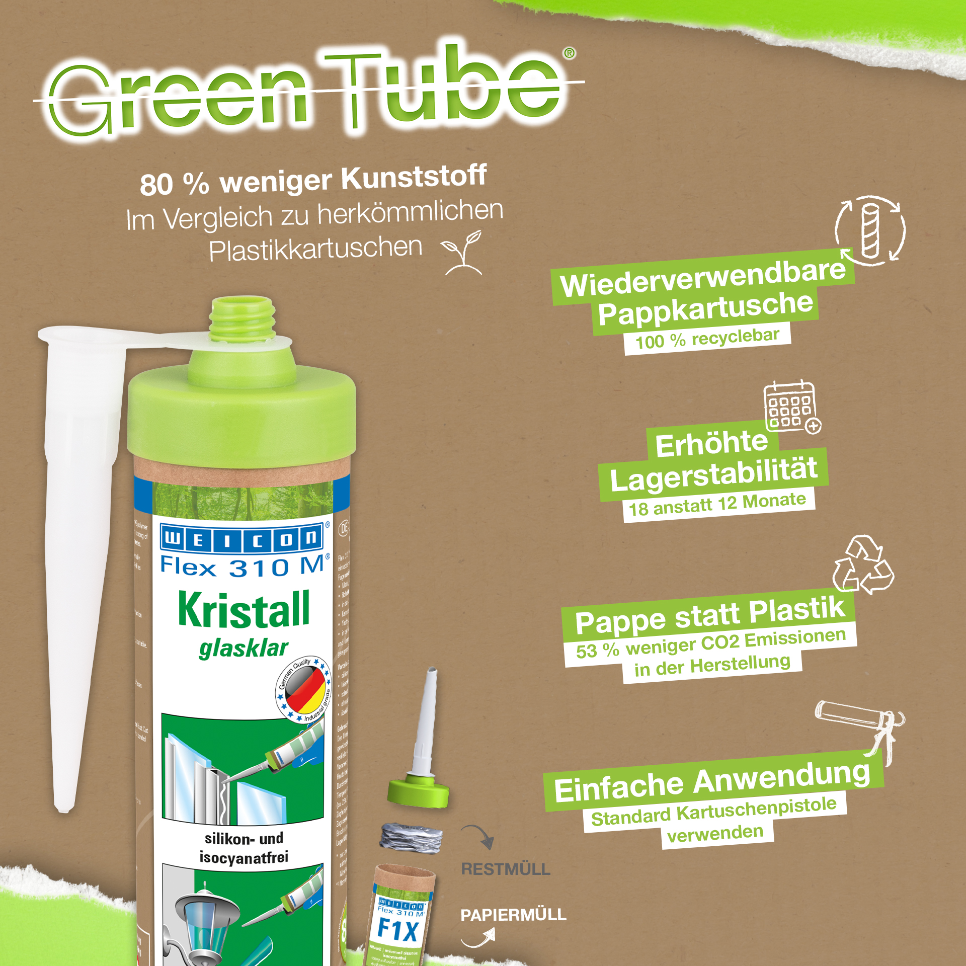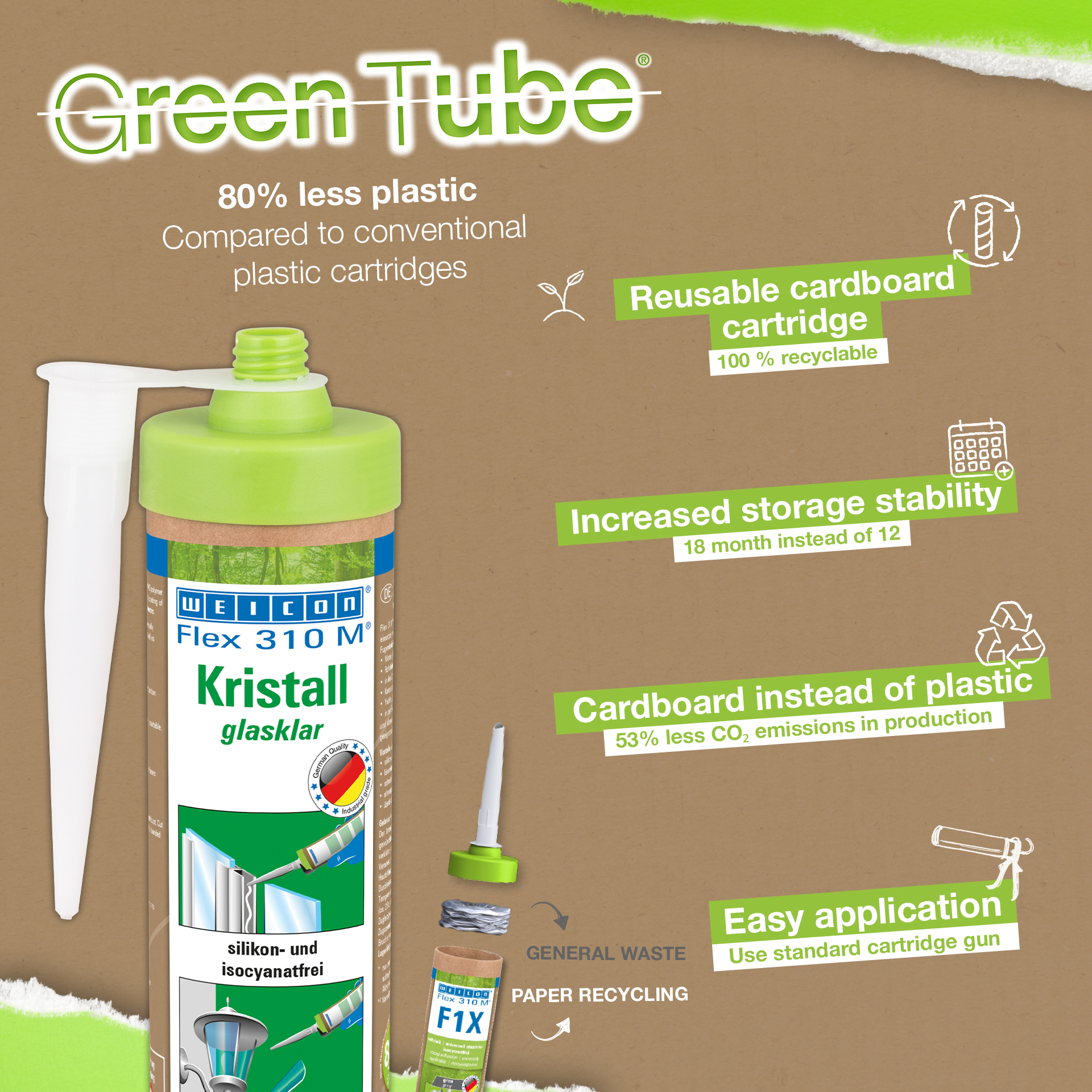 WEICON Flex 310 M Kristall ist transparent, haftstark, „nass in nass“ überlackierbar, hat eine hervorragende Alterungsbeständigkeit, eine gute UV-Stabilität, ist silicon-, isocyanat-, halogen- und lösemittelfrei. Es ist ISEGA zertifiziert und kann als Klebstoff in der Lebensmitteltechnologie verwendet werden. Flex 310 M Kristall ist ein elastischer Klebstoff auf MS-Polymer-Basis und eignet sich für Verklebungen von Glas, PC* und Acrylglas*, Metallen, vielen Kunststoffen, Keramik, Holz und Stein. Das Produkt ist nach der Aushärtung glasklar und besonders geeignet für elastische Verbindungen, bei denen der Klebstoff nicht sichtbar sein soll bzw. darf. Es kann in der Kunststoffverarbeitung, im Metallbau, im Behälter- und Apparatebau, in der Lüftungs- und Klimatechnik, in der Elektro- und Leuchtenindustrie, im Messe- und Ladenbau und überall dort, wo Silicone bzw. siliconhaltige Produkte nicht geeignet sind, zum Einsatz kommen. (* = Nur spannungsfrei verkleben)