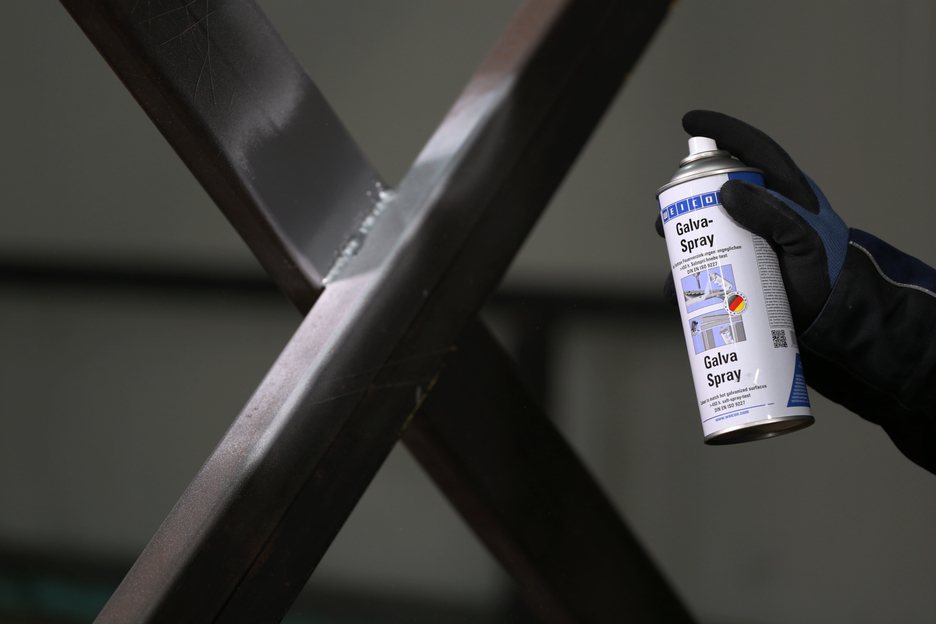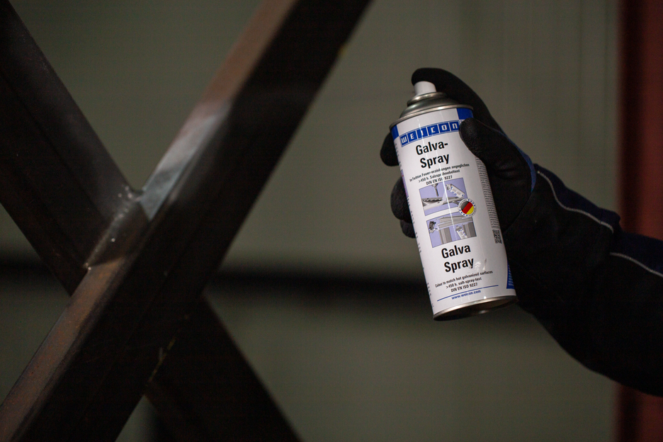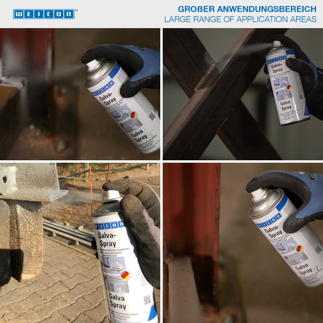 WEICON Galva-Spray dient als dauerhafte Schutzschicht für alle Metalloberflächen. Es schützt Metalle gegen Rost und Korrosion und ist schnelltrocknend und festhaftend. Das Spray ist salz- und süßwasserbeständig und temperaturbeständig bis ca. +300 °C (+572 °F). Im Salzsprühnebeltest gemäß DIN EN ISO 9227 zeigten Metallteile, die mit Galva-Spray beschichtet wurden, auch nach mehr als 450 Stunden keinerlei Korrosion. Das Spray dient zur Ausbesserung beschädigter Verzinkungen im angeglichenen Farbton, als hochwertige Rostschutzgrundierung, beispielsweise bei Lackierungen an Karosserien, zur Beschichtung von Schweiß- und Bohrstellen und als leitende Zwischenschicht beim Punktschweißen.