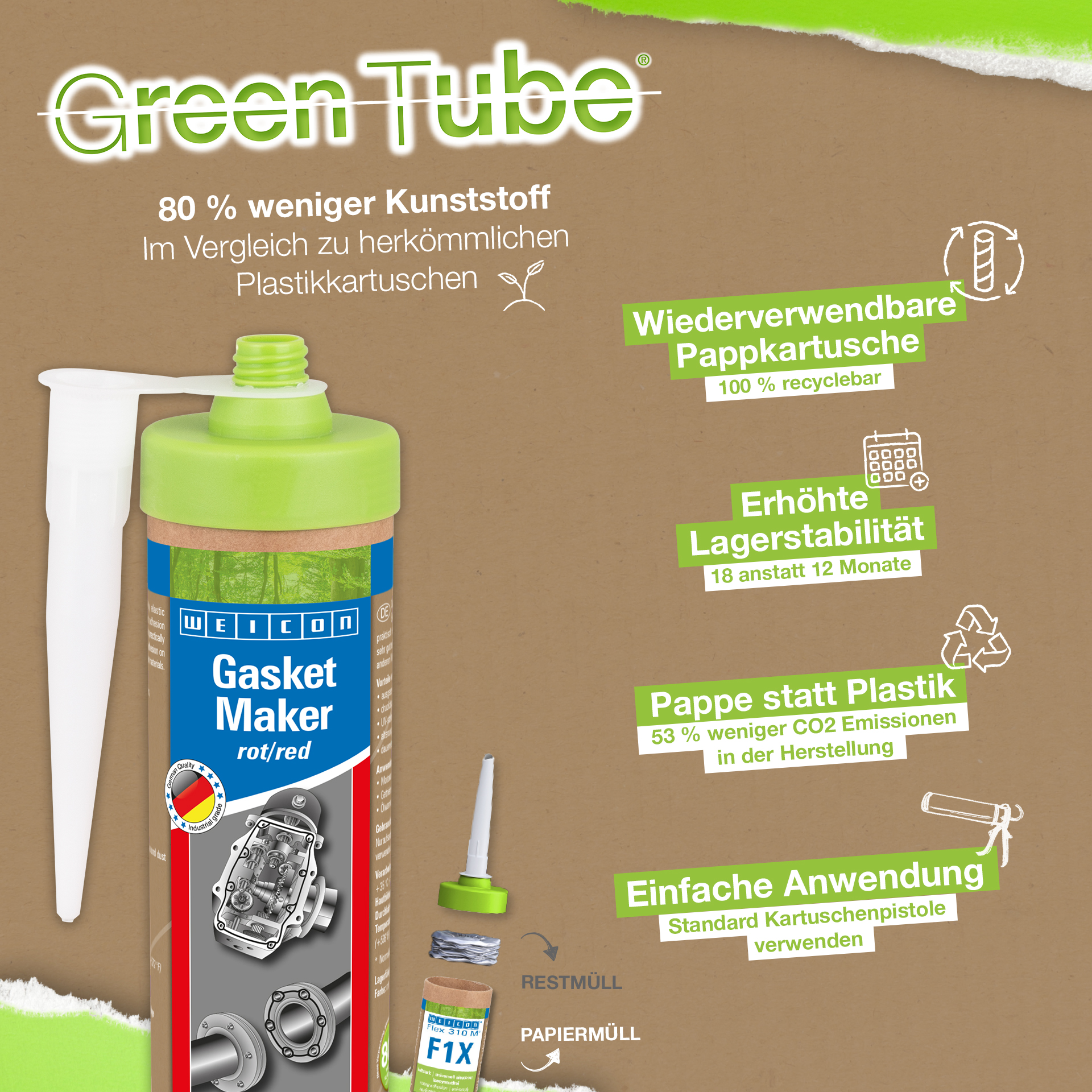 WEICON Gasket Maker ist ein haftstarker, dauerelastischer Spezial-Dichtstoff, der durch Luftfeuchtigkeit praktisch schrumpffrei aushärtet. Gasket Maker haftet sehr gut auf Stahl, Aluminium, Glas, Keramik und vielen anderen Werkstoffen. Gasket Maker verfügt über ausgezeichnete Temperatur-, Öl- und Fettbeständigkeiten, ist druckbeständig, UV-stabil, alterungsbeständig und dauerelastisch. Der Spezial-Dichtstoff kann an Motoren und Wasserpumpen, Getrieben und Achsen, Ölwannen uvm. zur Anwendung kommen.