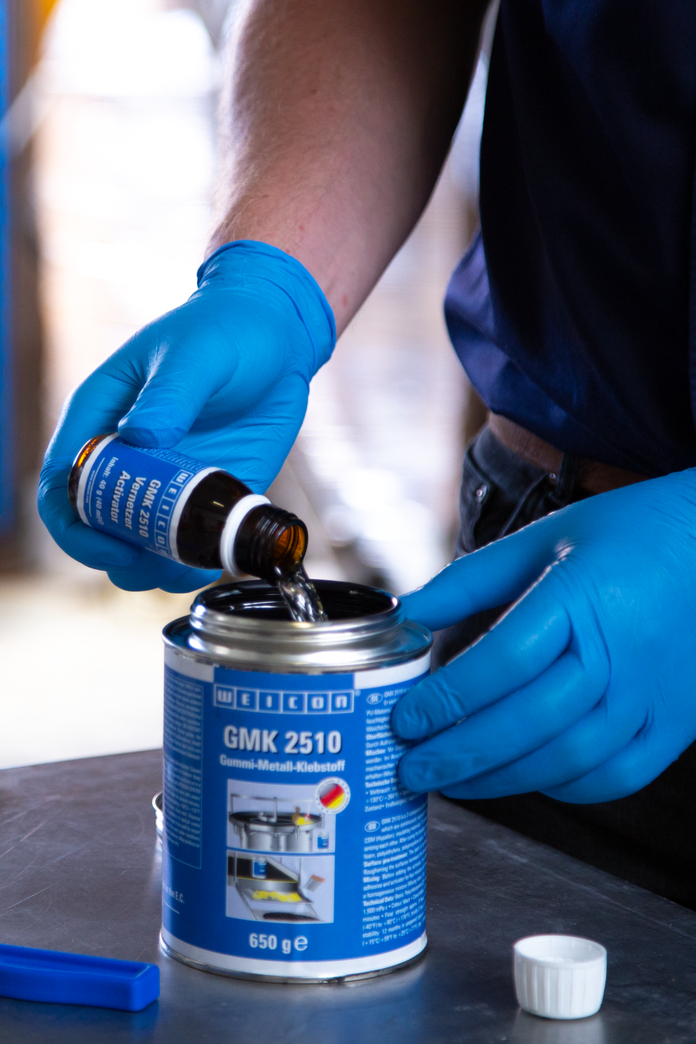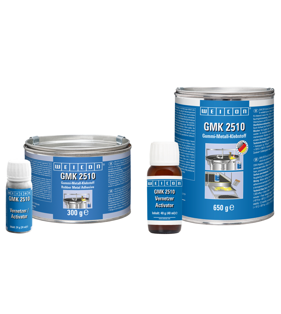 WEICON GMK 2510 ist ein 2-Komponenten-Klebstoff auf Polychloroprenbasis für vollflächige und dauerelastische Verklebungen, die dauerhaft dynamischen Belastungen ausgesetzt sind. Der Vorteil gegenüber 1-Komponenten-Kontaktklebstoffen liegt in der deutlich besseren Haftung und der verbesserten Temperaturbeständigkeit. GMK 2510 verklebt Gummi, Metall, Textilien, Leder, Moosgummi (Neopren), CSM (Hypalon), Dämmmaterialien, haftbeschichtetes PU-Material sowie Holz, Stein und viele Kunststoffe mit- und untereinander. Die Verbindungen sind nach der Aushärtung feuchtigkeitsbeständig. WEICON GMK 2510 ist für Werkstoffe wie z.B. Polystyrolschaum, Polyethylen, Polypropylenteile, PVC-Weichschaum und PVC-Kunstleder nicht geeignet.