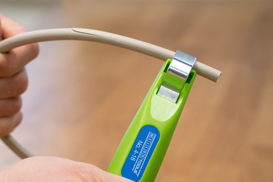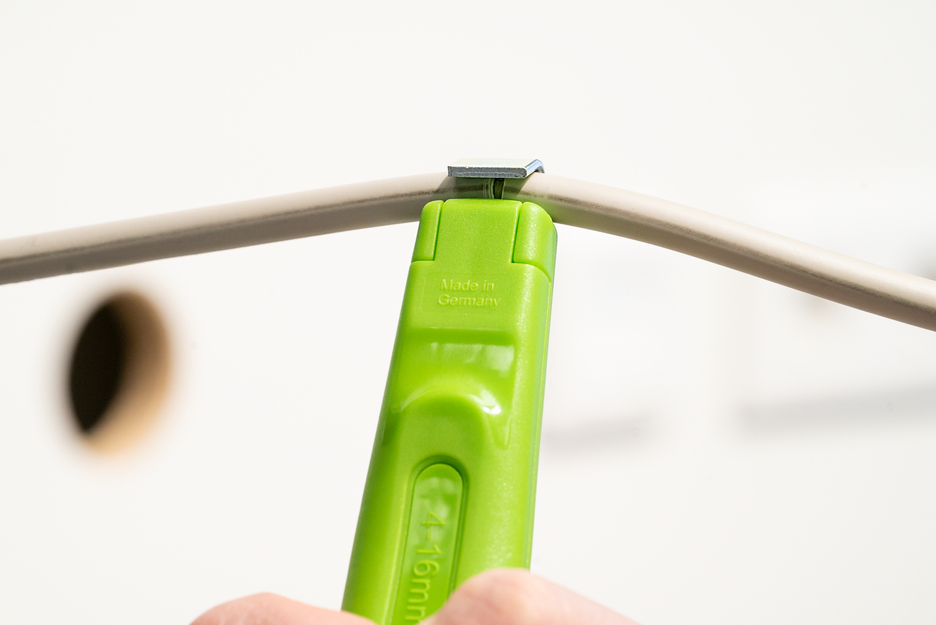 Mit der Green Line wurde eine ganz spezielle Werkzeugreihe entwickelt. Die Werkzeuge bestehen aus bis zu 97 % nachwachsenden Rohstoffen, sind recyclebar und verfügen über eine exzellente Ökobilanz. Das Kabelmesser 4-16 ermöglicht ein präzises, schnelles und sicheres Abmanteln aller gängigen Rundkabel mit einem Durchmesser zwischen 4 und 16 Millimeter. Das Kabelmesser verfügt über einen ergonomisch geformten, rutschfesten Griff. Mit Hilfe einer Stellschraube am Griffende kann die Schnitttiefe des Schneidmessers stufenlos reguliert werden. Dies verhindert eine Beschädigung der inneren Leiter. Das Schneidmesser ist selbstdrehend im Gehäuse integriert und ermöglicht so die automatische Umstellung von Rund- auf Längsschnitt.