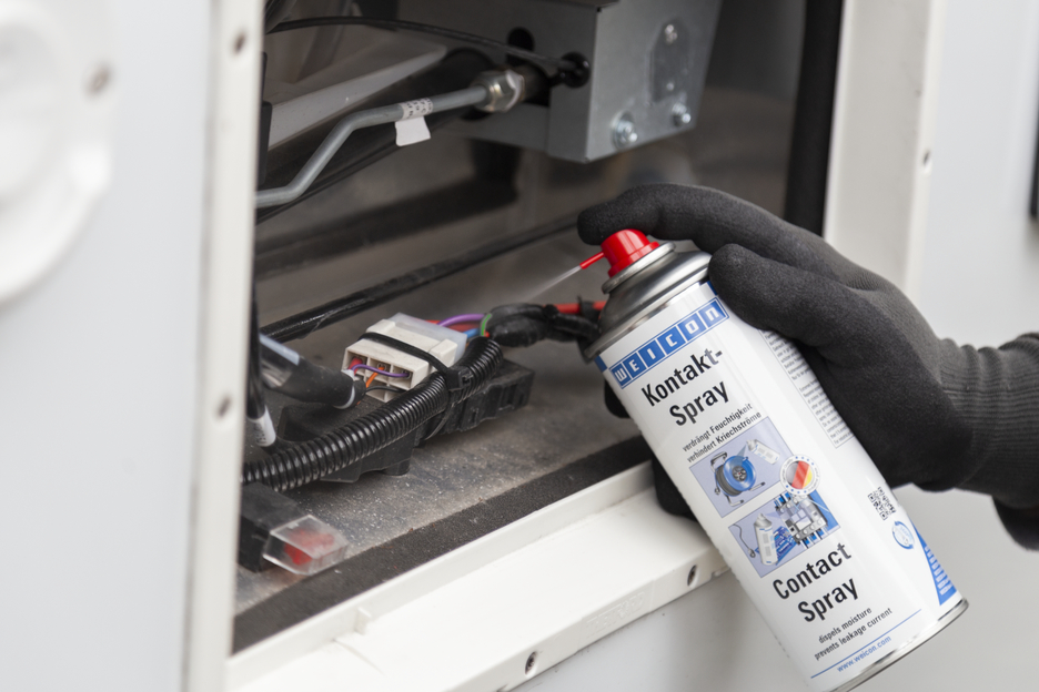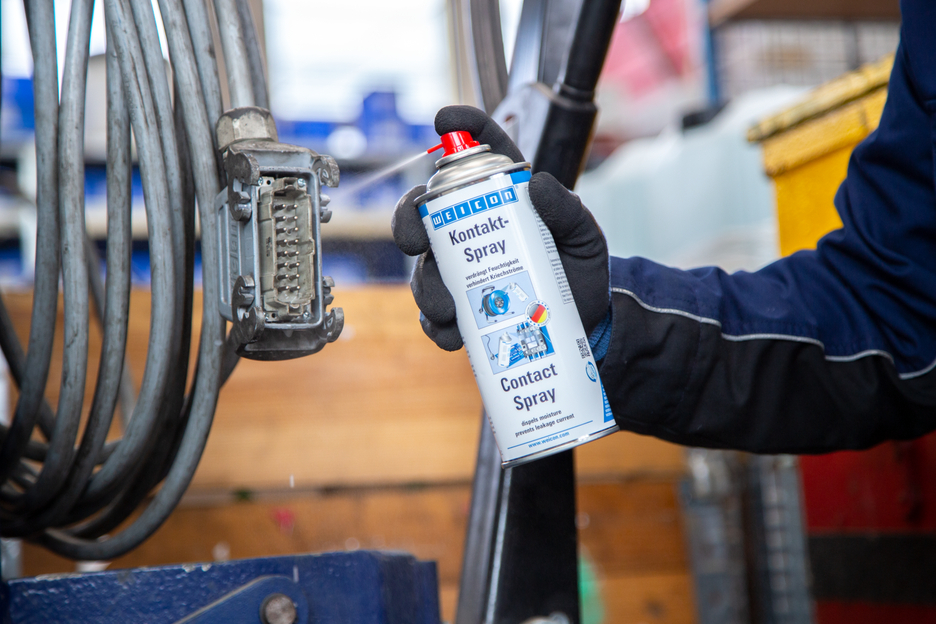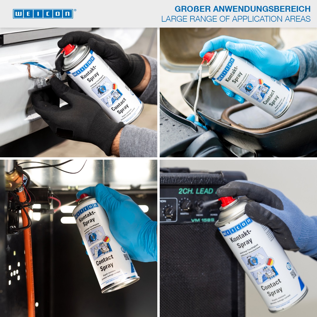 WEICON Kontakt-Spray basiert auf einer speziellen Wirkstoffkombination für die Pflege und den Schutz von elektrischen Kontakten und Komponenten. Es verdrängt Feuchtigkeit von elektrischen Kontakten und verhindert Kriechströme und Spannungsverluste und hält Kontakte, Sicherungen, Kabelanschlüsse etc. frei von Oxidation und Sulfidschichten. WEICON Kontakt-Spray findet daher Anwendung an z.B. Sicherungskästen, Sprechanlagen, Torantrieben, Steckdosen, Kabel- und Steckverbindungen, Kabeltrommeln und -verlängerungen, elektrischen Gartengeräten sowie Beleuchtungsanlagen.