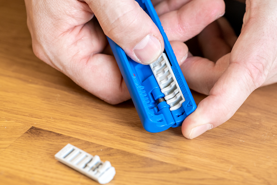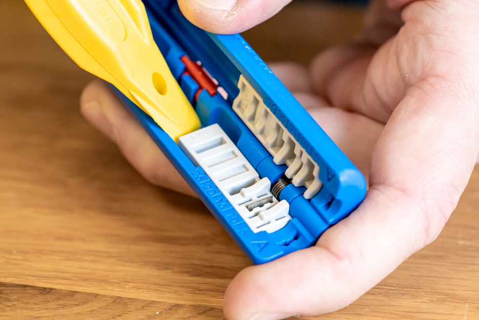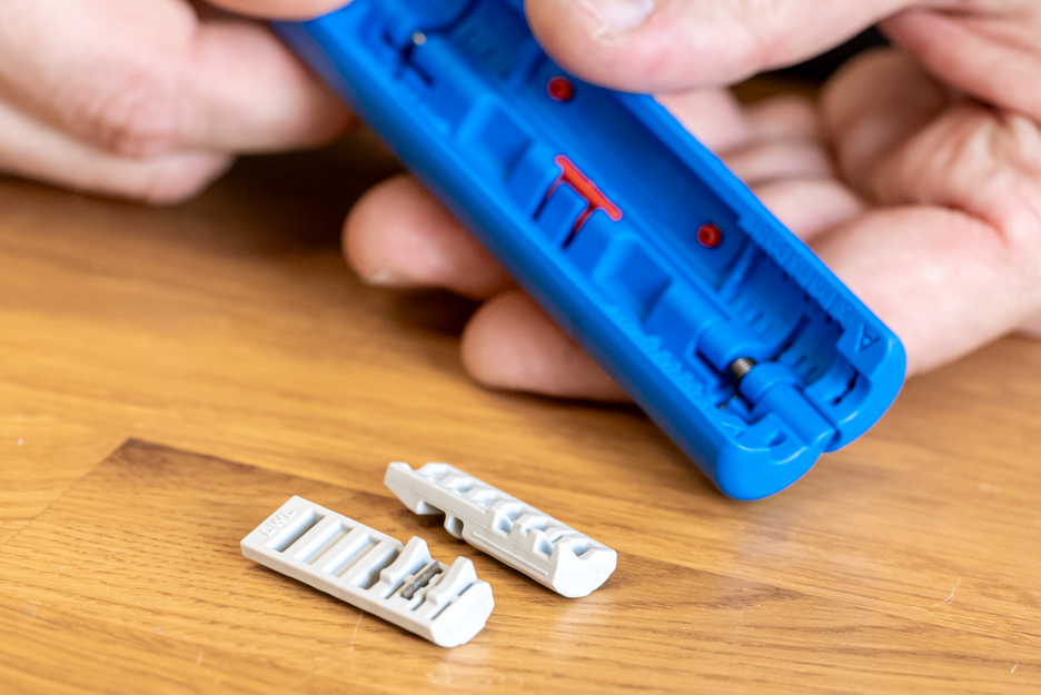 schneidet exakt die PE-Röhrchen bei Glasfaserkabeln an | schnelles Freilegen der Bündeladern | modulares Messerpaar für LWL-Tubes