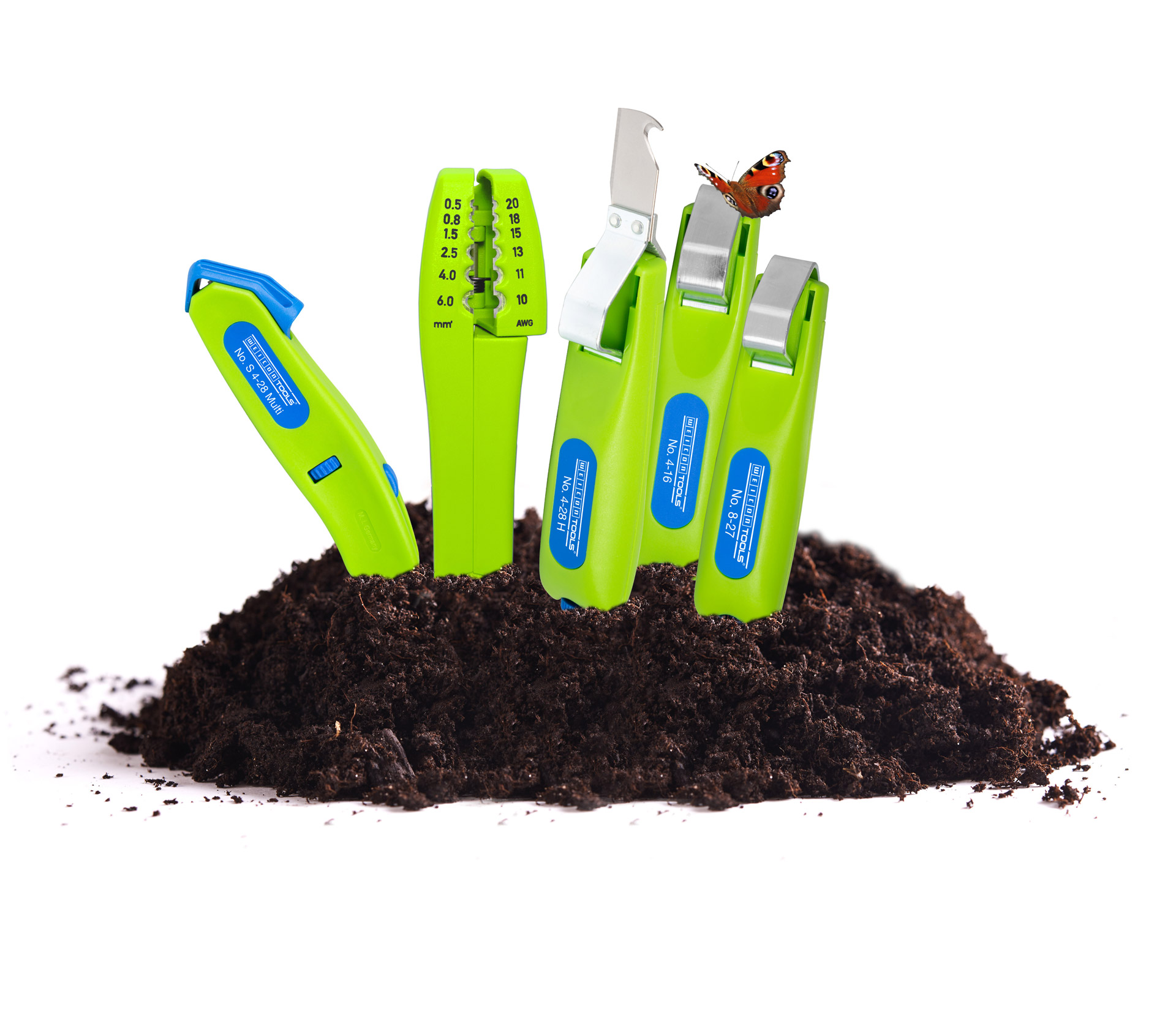 BU (Gruppenbild): Die nachhaltigeren Abisolierwerkzeuge der Weicon Tools Green Line bestehen aus bis zu 97 Prozent nachwachsenden Rohstoffen.