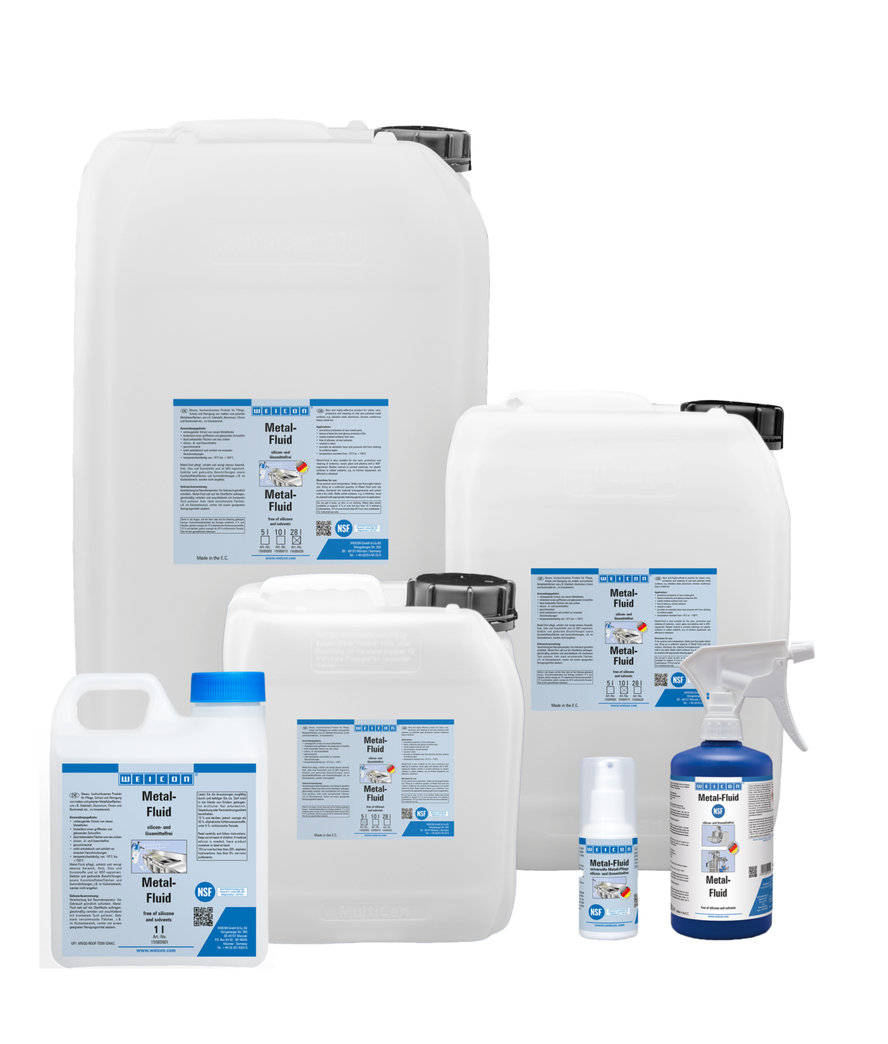 WEICON Metal-Fluid ist ein Pflege- und Reinigungsmittel für matte und polierte Oberflächen im Innenbereich und ist NSF-zertifiziert. Metal-Fluid pflegt, schützt und reinigt sowohl Metalloberflächen als auch Keramik, Holz, Glas und Kunststoffe. Geätzte und gedruckte Beschriftungen sowie Kunststoffoberflächen und Gummidichtungen werden nicht angelöst.