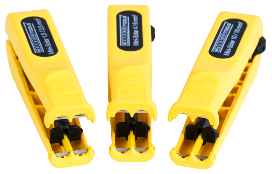 Der Entmanteler Mini-Solar 4/6 mm² ermöglicht ein schnelles und einfaches Abisolieren von Solarkabeln mit einem Leiterquerschnitt von 4,0 oder 6,0 Quadratmillimetern. Eine Einstellung der Schnitttiefe ist dabei nicht erforderlich. Im Werkzeug wurde ein integrierter Längenanschlag von 6-28 mm verbaut. Zusätzlich verfügt der glasfaserverstärkte Entmanteler über einen gut zugänglichen Seitenschneider für Kabel bis 10 mm². Der Einsatz des Solar-Werkzeugs liefert beim Abisolieren stets ein präzises Schnittbild. Darüber hinaus kann die Mini-Solar 4/6 mm² arretiert werden und lässt sich so platzsparend verstauen.