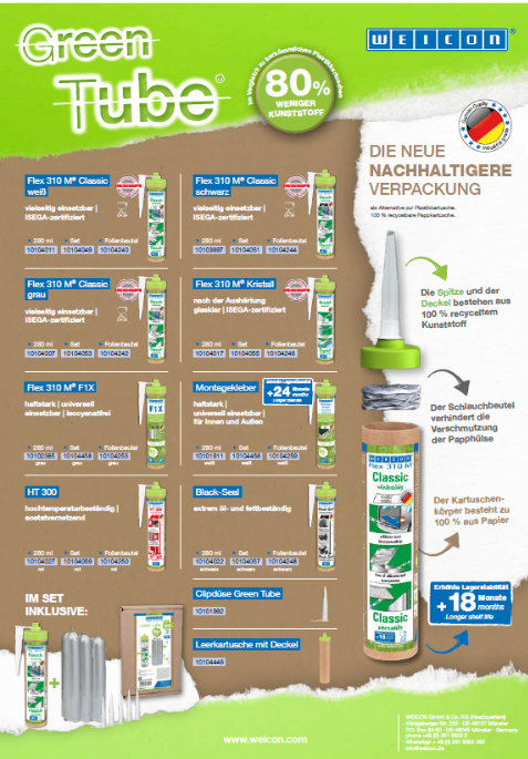 In der Herstellung der Green Tube Kartusche wird 80 % weniger Kunststoff verarbeitet als für herkömmliche Kartuschen. Der Kartuschenkörper besteht zu 100 % aus gehärteter Pappe. Die Produktion verursacht 53 % weniger CO2-Emissionen als die Herstellung einer PE-Kartusche – ein klarer Vorteil für Klima und Umwelt.