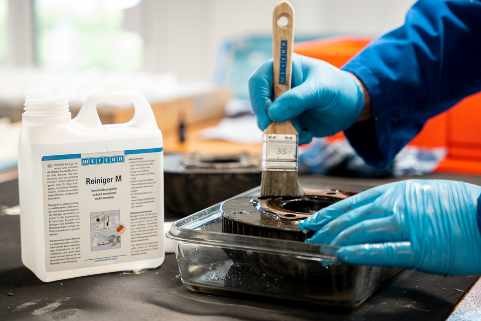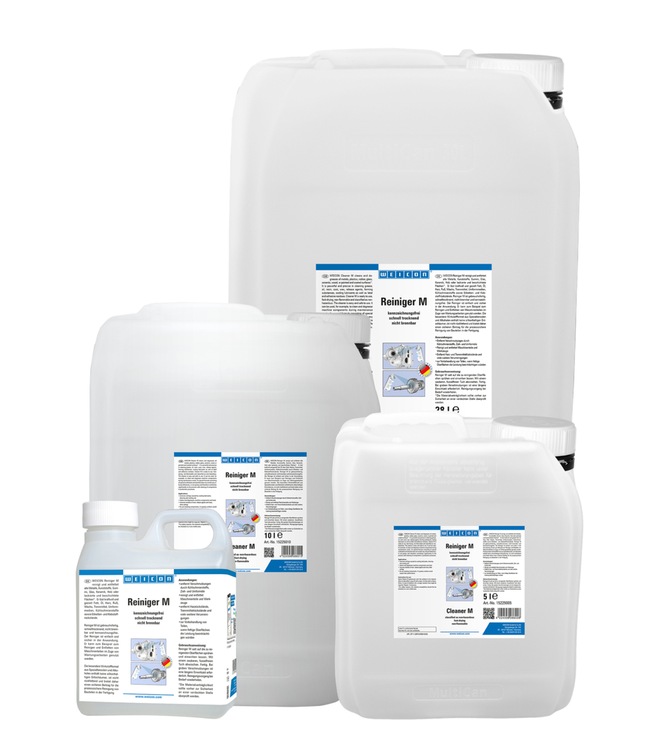 WEICON Reiniger M reinigt und entfettet alle Metalle, Kunststoffe, Gummi, Glas, Keramik, Holz oder lackierte und beschichtete Flächen. Er löst kraftvoll und gezielt Fett, Öl, Harz, Ruß, Wachs, Trennmittel, Umformmedien, Kühlschmierstoffe sowie Etiketten- und Klebstoffrückstände. Reiniger M ist gebrauchsfertig, schnelltrocknend, nicht brennbar und kennzeichnungsfrei. Der Reiniger ist einfach und sicher in der Anwendung. Er kann zum Beispiel zum Reinigen und Entfetten von Maschinenteilen und Werkzeugen verwendet werden. Die besondere Wirkstoffformel aus Spezialtensiden und Alkoholen enthält keine silikonhaltigen Entschäumer, ist nicht rückfettend und bietet daher einen sicheren Beitrag für die prozesssichere Reinigung von Bauteilen in der Fertigung.