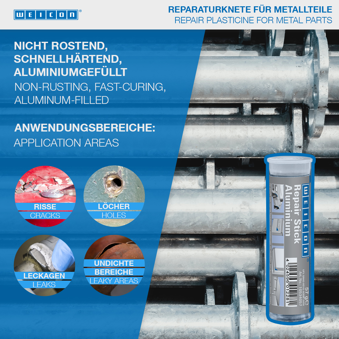 Für schnelle und nicht rostende Reparaturen und Verklebungen von Metallteilen. Zum Ausbessern von Rissen, Löchern, Leckagen und Undichtigkeiten an Karosserien, Getriebegehäusen und Behältern, Fensterrahmen und Profilen, Booten und Modellen. WEICON Repair Stick Aluminium kann im Maschinen- und Anlagenbau, in der Automobilindustrie, im Getriebebau, im Modellbau und in vielen weiteren Bereichen eingesetzt werden.