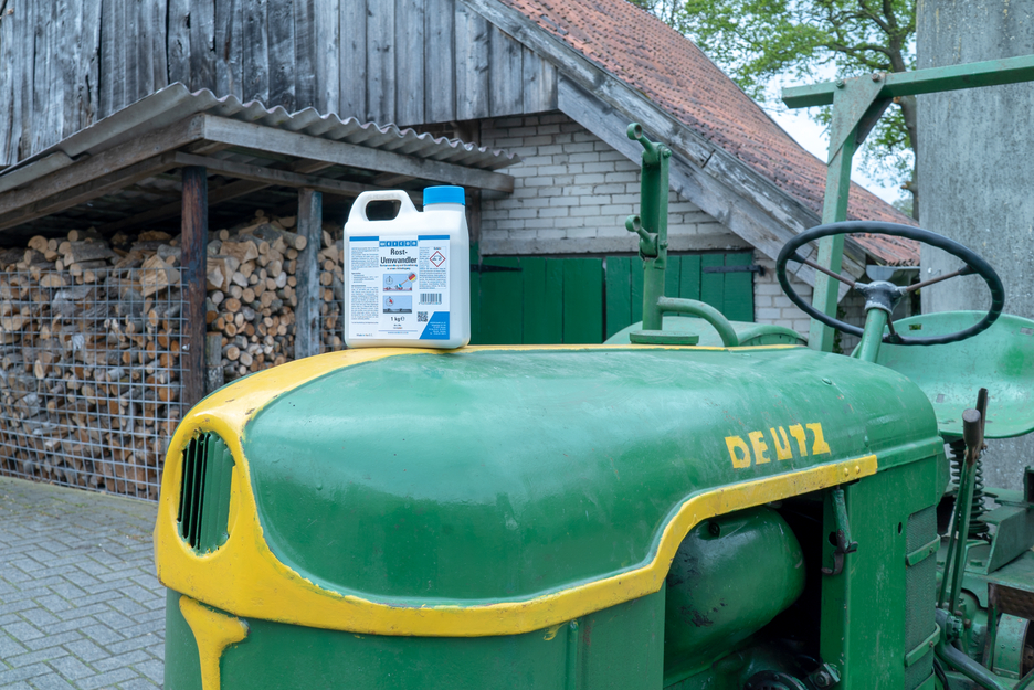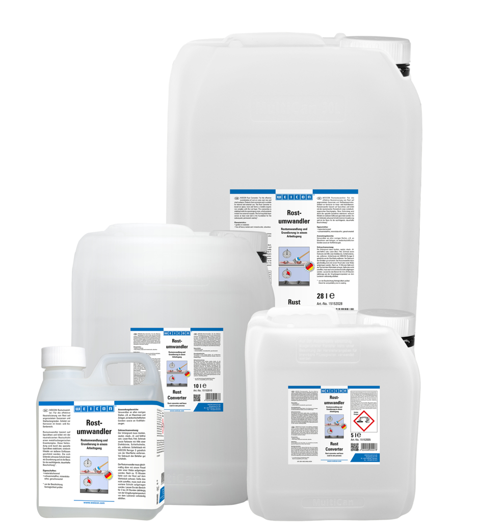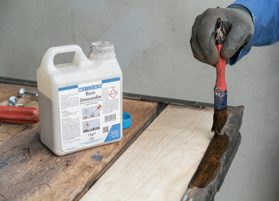 WEICON Rostumwandler dient zur Neutralisierung von Rost auf angerosteten Eisen- und Stahluntergründen und stoppt zuverlässig den Korrosionsprozess. Durch die spezielle Wirkstoffformel aus Säure und Tannin dringt der Rostumwandler in den Rost ein. Er wandelt in einem chemischen Prozess Eisenoxide in eine stabile Schicht um und hinterlässt zusätzlich durch Zinkphosphat einen temporären Korrosionsschutz. Je nach Kohlenstoffgehalt des Metalls verfärbt sich die behandelte Fläche bläulich-, bräunlich bis schwarz. Die Schicht bildet die ideale Basis für darauffolgende Schutzbeschichtungen, wie z. B. WEICON Zink-Spray. Mit WEICON Rostumwandler werden optimale Ergebnisse bei leicht verrosteten Oberflächen mit einem Rostgrad A und B erreicht. Loser Rost und lose Teile sollten vorher mechanisch entfernt werden. Der Umwandler wird erst aktiv, wenn er auf Rost oder Metall aufgetragen wird und kann großflächig an allen rostigen Stellen, beispielsweise an Maschinen und Anlagen, an landwirtschaftlichen Geräten sowie an Kraftfahrzeugen verwendet werden. Im Gegensatz zu anderen Umwandlern wird WEICON Rostumwandler nach Ablauf der Reaktionszeit mit klarem Wasser und einem Schwamm oder einer weichen Bürste von der behandelten Oberfläche entfernt. Dies dient der Beseitigung von Reststoffen, die sich durch den Umwandlungsprozess gebildet haben.