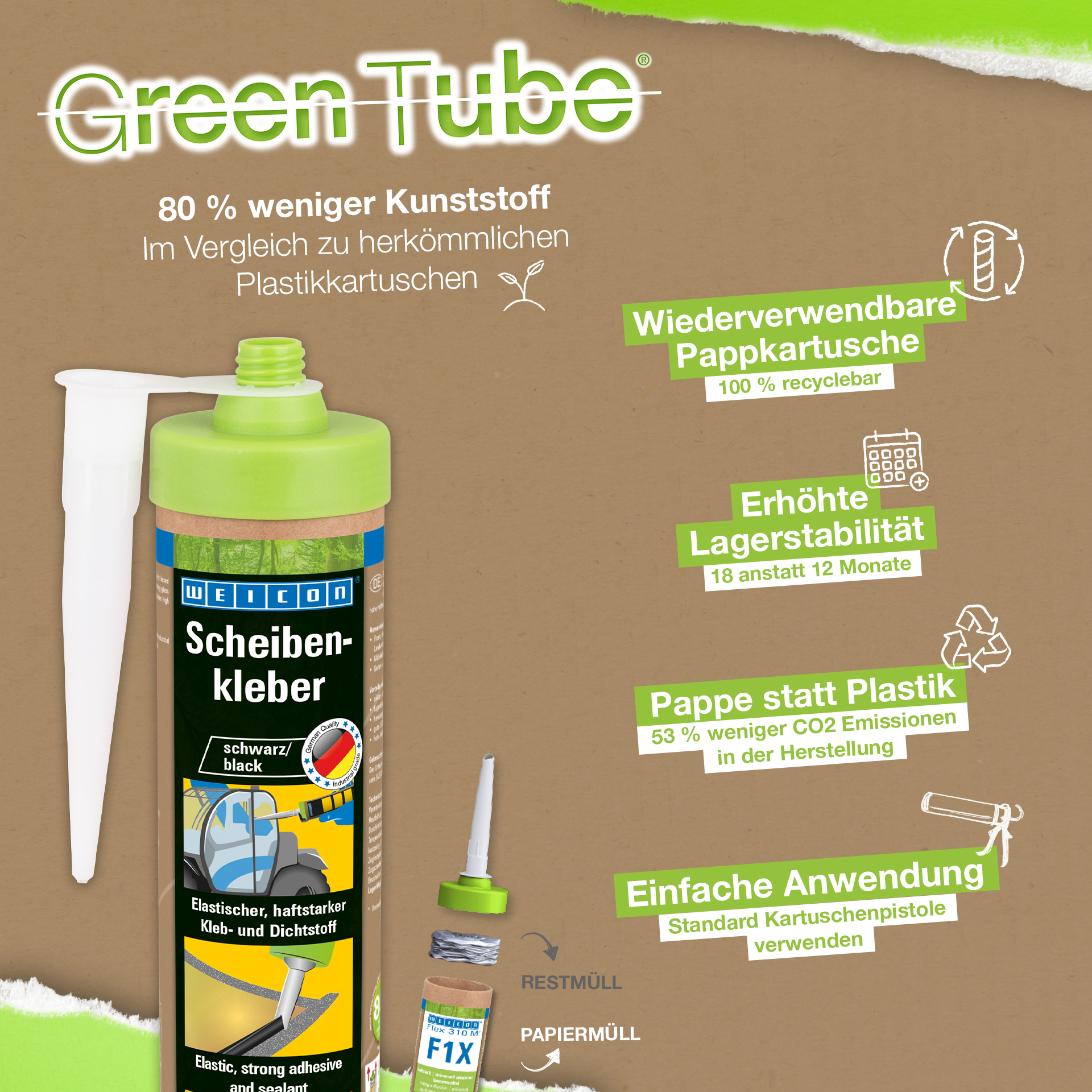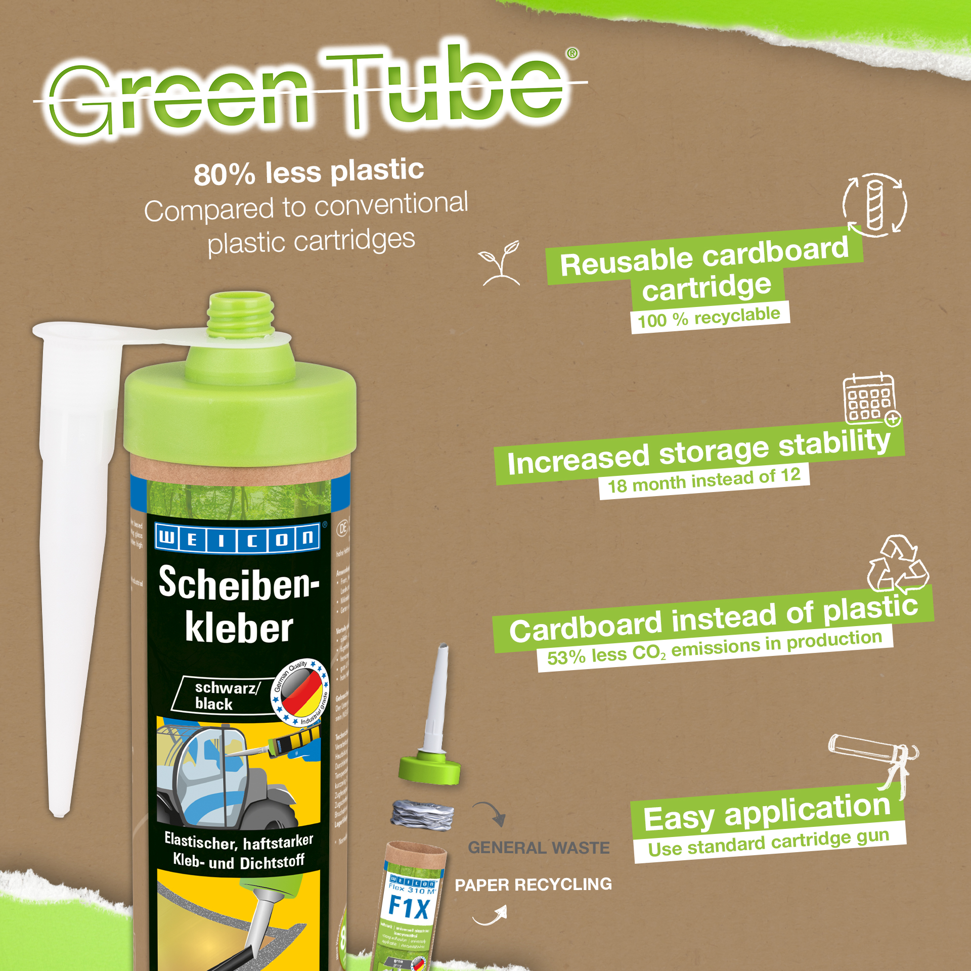 WEICON Scheibenkleber ist ein elastischer 1-K Kleb- und Dichtstoff auf MS-Polymer-Basis, der speziell zur Montage von Glas und Scheiben entwickelt wurde. Beispielsweise können mit dem Klebstoff Front-, Heck- und Seitenscheiben in Flurförderzeuge, Landwirtschafts- und Baumaschinen eingebaut werden. Er eignet sich aber auch für die Herstellung von Möbeln oder für die Montage im Garten- und Landschaftsbau. Der Scheibenkleber hat eine hohe Haftkraft auf vielen Oberflächen und härtet durch Luftfeuchtigkeit aus. Der Klebstoff hat eine hervorragende Alterungsbeständigkeit und eine gute UV-Stabilität. Er ist fugenfüllend und geruchsneutral und ist frei von Silikon, Isocyanaten, Halogen und Lösemitteln.
