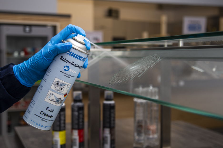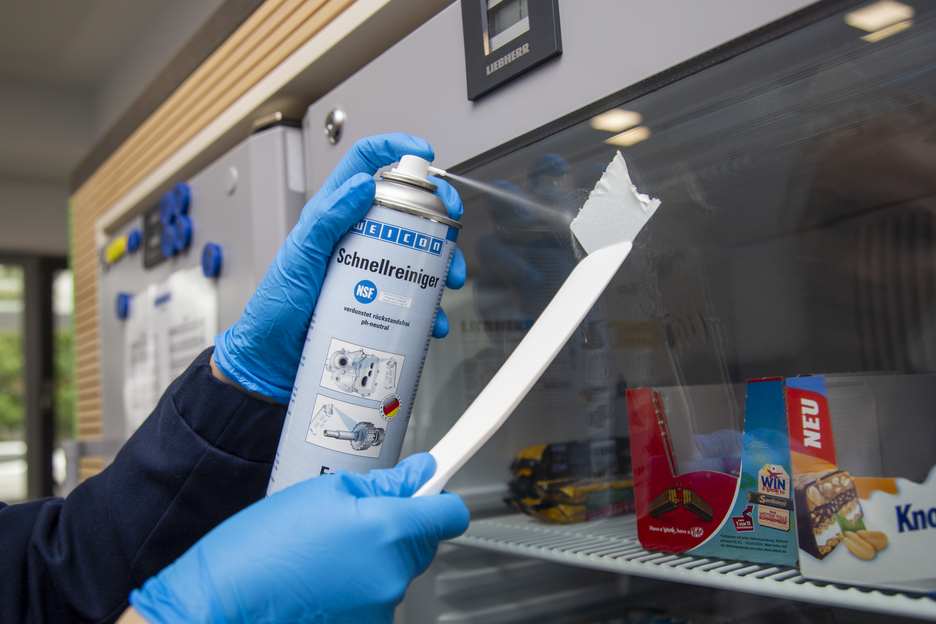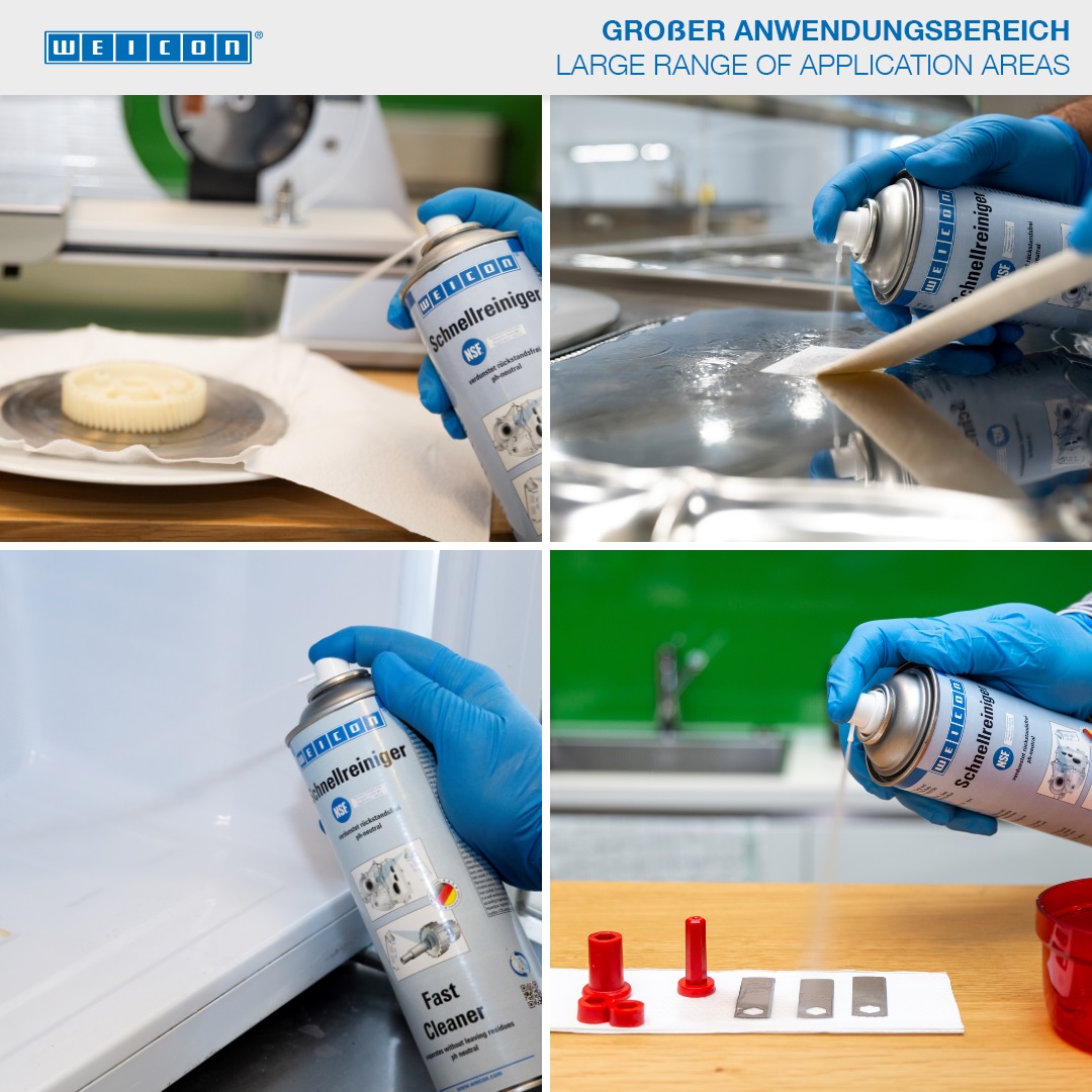 WEICON Schnellreiniger verfügt über eine NSF Registrierung für den Lebensmittelbereich und kann somit als Reiniger und Entfetter zur Schmutzentfernung im Rahmen von Instandsetzungsarbeiten sowie zur Entfernung von Klebstoffen in der Lebensmittelindustrie, in der Nahrungsmittel- und Getränkeindustrie sowie der pharmazeutischen und kosmetischen Industrie eingesetzt werden. Schnellreiniger wird zum Reinigen und Entfetten von Oberflächen verwendet, die mit WEICON Kleb- und Dichtstoffen verklebt bzw. abgedichtet oder mit WEICON Metallsprays beschichtet werden sollen. Schnellreiniger ist pH-neutral und Materialverträglich und kann auf vielen Werkstoffen, wie z.B. Metalle, Glas, Keramik und den meisten Gummi und Kunststoffen, eingesetzt werden. Aufgrund seiner speziellen Rezeptur und der daraus resultierenden NSF Registrierung, kann der Schnellreiniger zur Verbesserung der Arbeitsplatzsicherheit und des Gesundheitsschutzes beitragen.