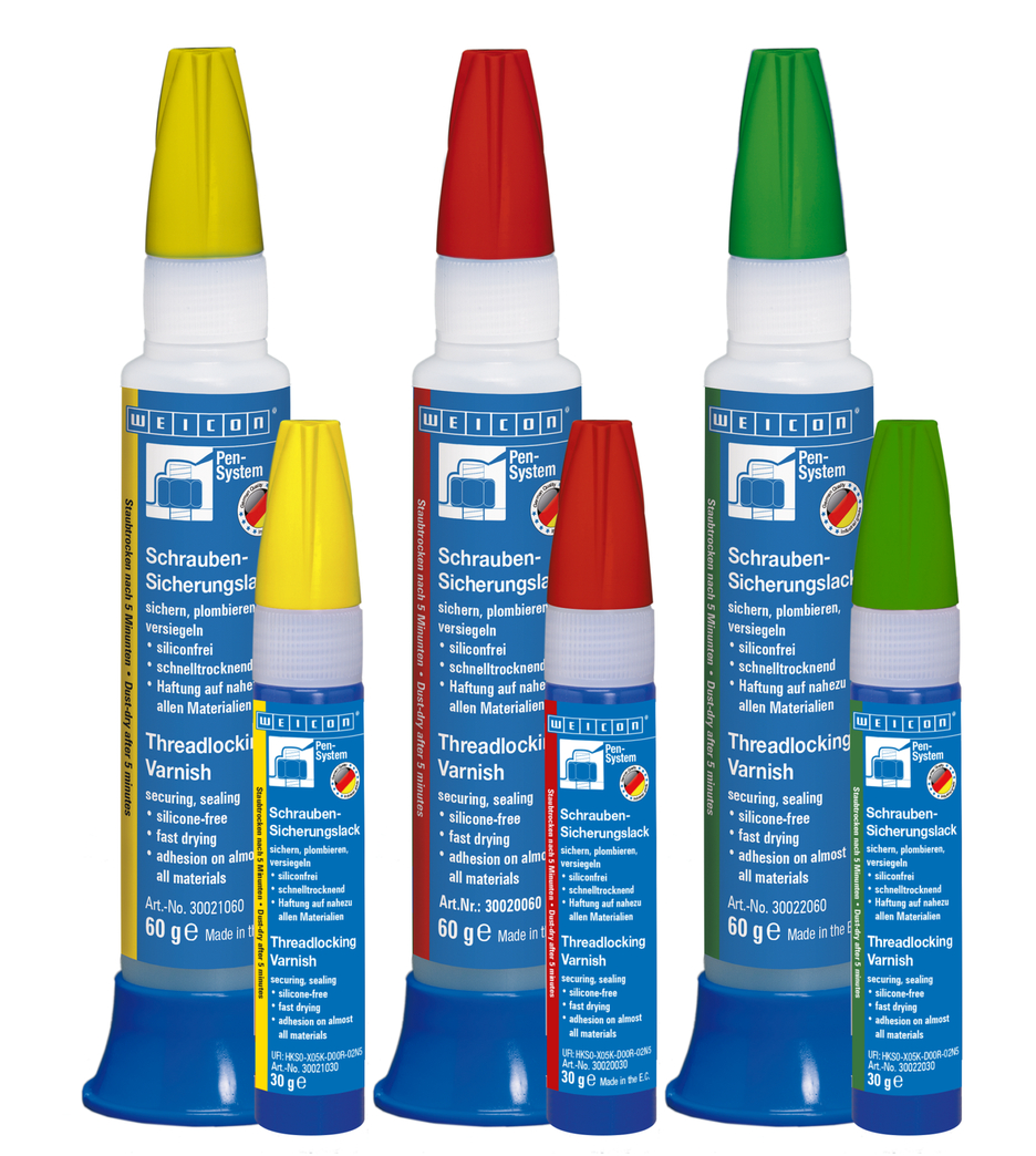 WEICON Schraubensicherungslack ist ein lösemittelhaltiger und schnelltrocknender Sicherungs-, Kennzeichnungs- und Plombierlack mit einer guten Haftung auf nahezu allen Materialien. Er dient als lösbare Sicherung, zum Schutz vor Eingriffen Fremder, als Abdeckung elektrisch leitender Teile sowie zum Schutz vor Korrosion und Beeinflussung durch Berührung. Das Produkt besitzt eine gute Beständigkeit gegen Wasser, Benzin, Diesel, Mineralöl, Parafinöl sowie verdünnte Säuren und Laugen. Der Schraubensicherungslack ist unentbehrlich zum Sichern von Schraubverbindungen aller Art, schützt vor Manipulationen und unberechtigtem Lösen von Schrauben und Verbindungen, dokumentiert die Qualitätssicherung, Fertigungskontrolle und Produktprüfung durch ein Lacksiegel und dient der visuellen Kontrolle von verbundenen justierten Teilen. In den Farben gelb, grün und rot lieferbar.