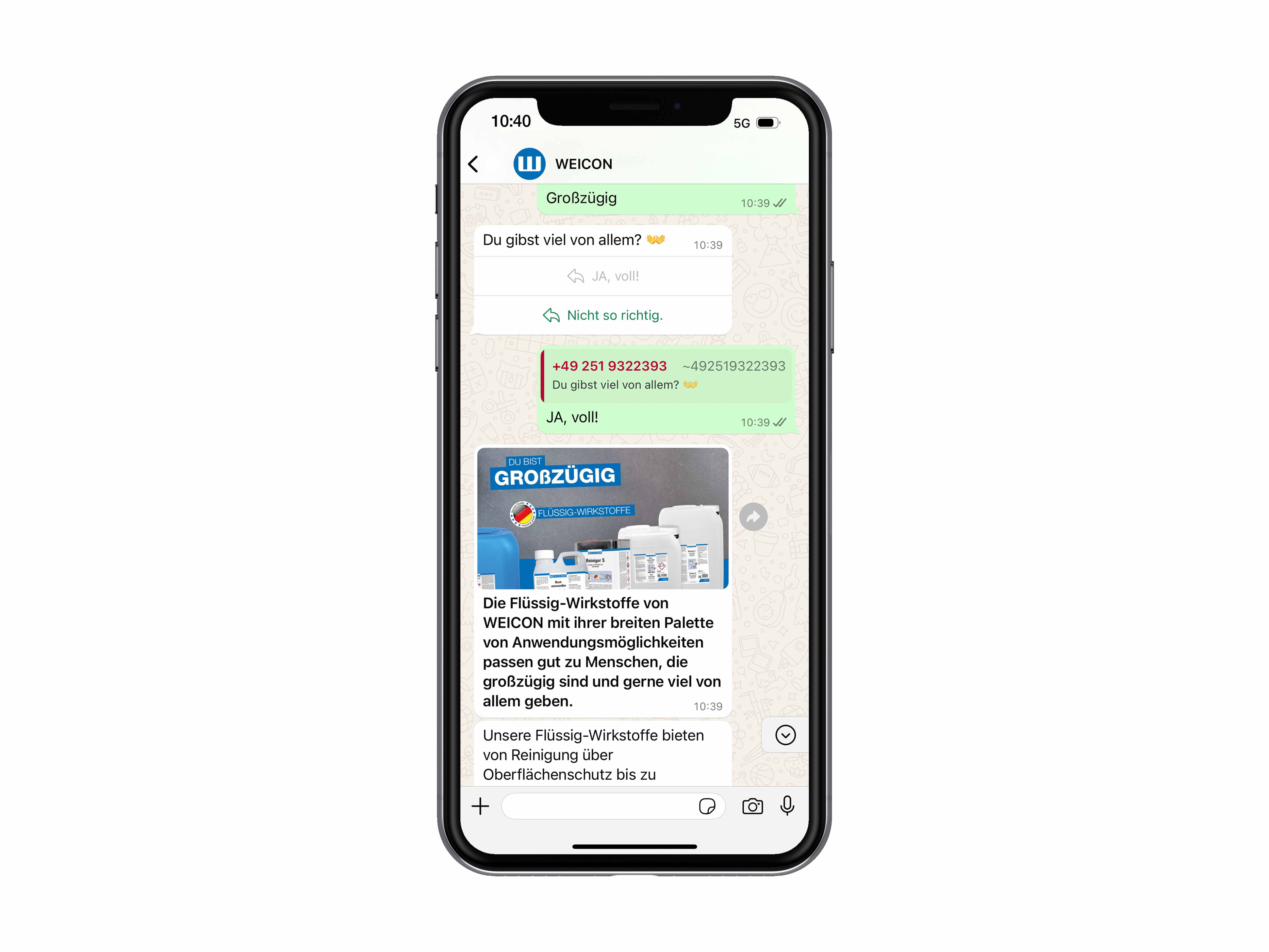 Sie interessieren sich im Allgemeinen für unsere Produkte? Sie wissen aber beispielsweise nicht, ob Sie lieber ein Schmieröl oder ein Schmierfett, einen 1K- oder 2K-Klebstoff verwenden möchten oder Ihnen noch das richtige Werkzeug fehlt? Dann informieren Sie sich mit Hilfe unseres WhatsApp Services oder machen Sie unseren „Welcher WEICON-Typ bin ich?“ Test auf WhatsApp.