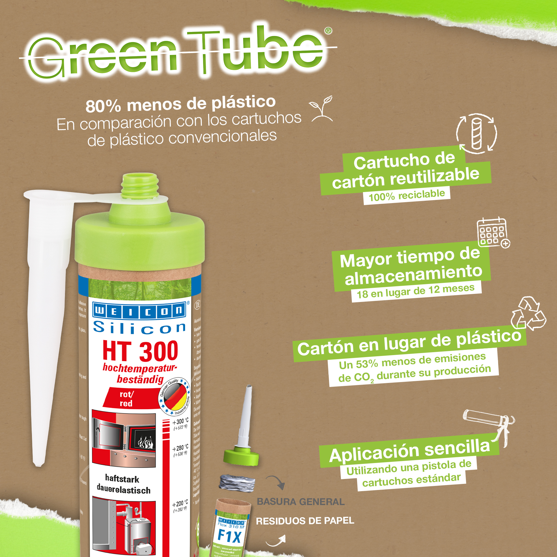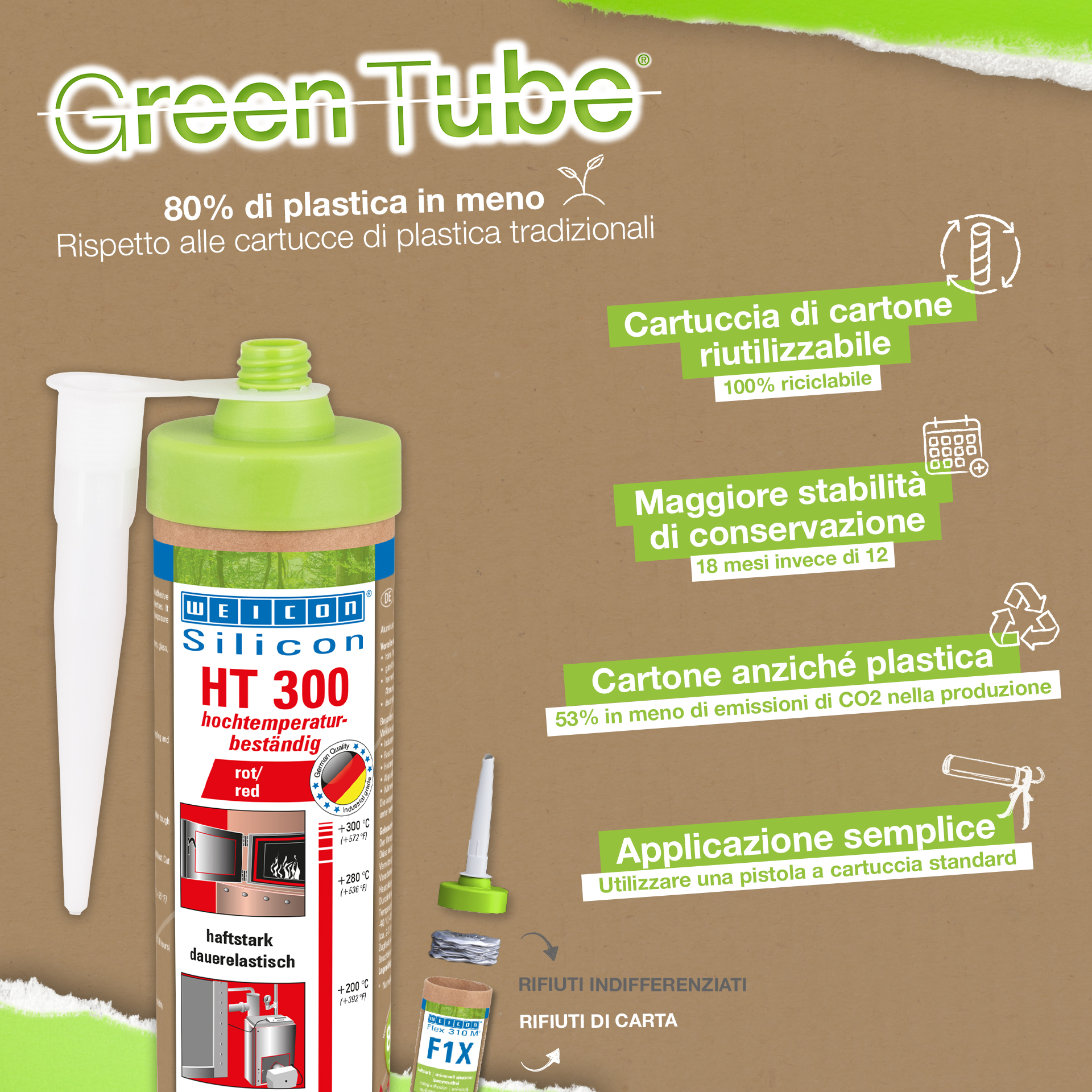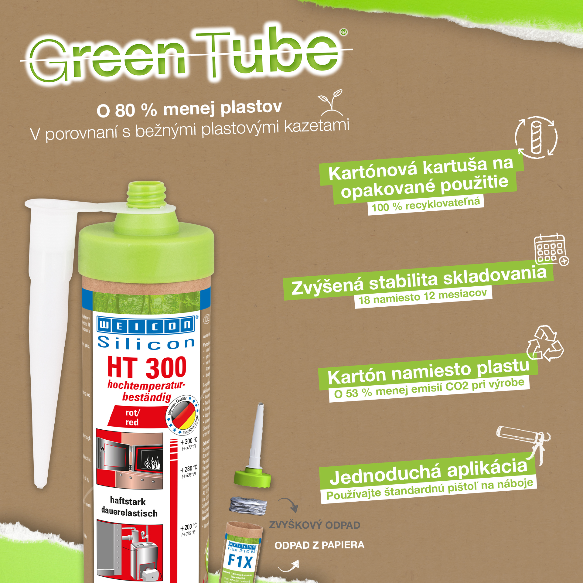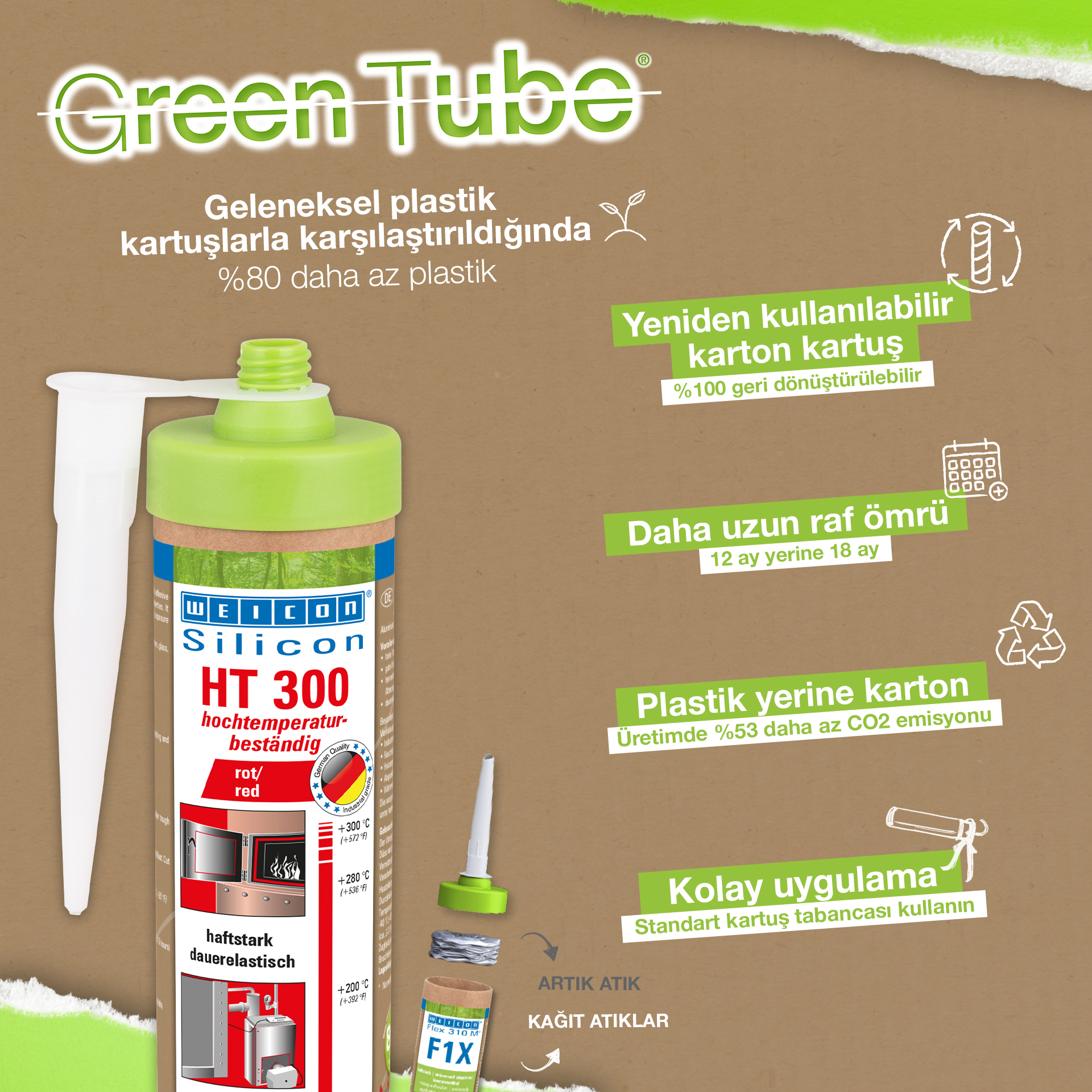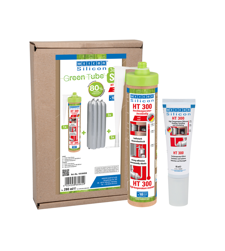 WEICON HT 300 ist hochtemperaturbeständig (+300 °C/+572 °F), lösemittelfrei, haftstark, acetatvernetzend, witterungs-, alterungs- und chemikalienbeständig und extrem elastisch (Bruchdehnung von ca. 300%). Das Produkt ist besonders geeignet für hitzebelastete Verklebungen und Abdichtungen und haftet sehr gut auf Stahl, Aluminium, Glas, Keramik und vielen weiteren Werkstoffen. Der Kleb- und Dichtstoff kann in Industrieöfen, Rauchgasanlagen, Heizungsanlagen, Abgasführungen, Wärmeschränken und in vielen weiteren Bereichen eingesetzt werden.