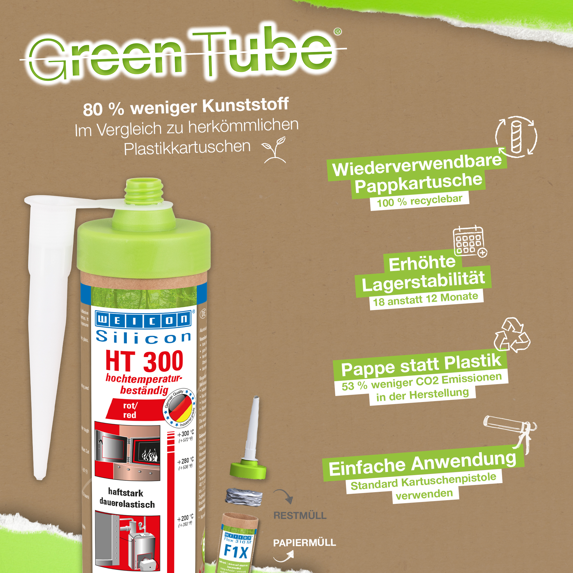 WEICON HT 300 ist hochtemperaturbeständig (+300 °C/+572 °F), lösemittelfrei, haftstark, acetatvernetzend, witterungs-, alterungs- und chemikalienbeständig und extrem elastisch (Bruchdehnung von ca. 300%). Das Produkt ist besonders geeignet für hitzebelastete Verklebungen und Abdichtungen und haftet sehr gut auf Stahl, Aluminium, Glas, Keramik und vielen weiteren Werkstoffen. Der Kleb- und Dichtstoff kann in Industrieöfen, Rauchgasanlagen, Heizungsanlagen, Abgasführungen, Wärmeschränken und in vielen weiteren Bereichen eingesetzt werden.