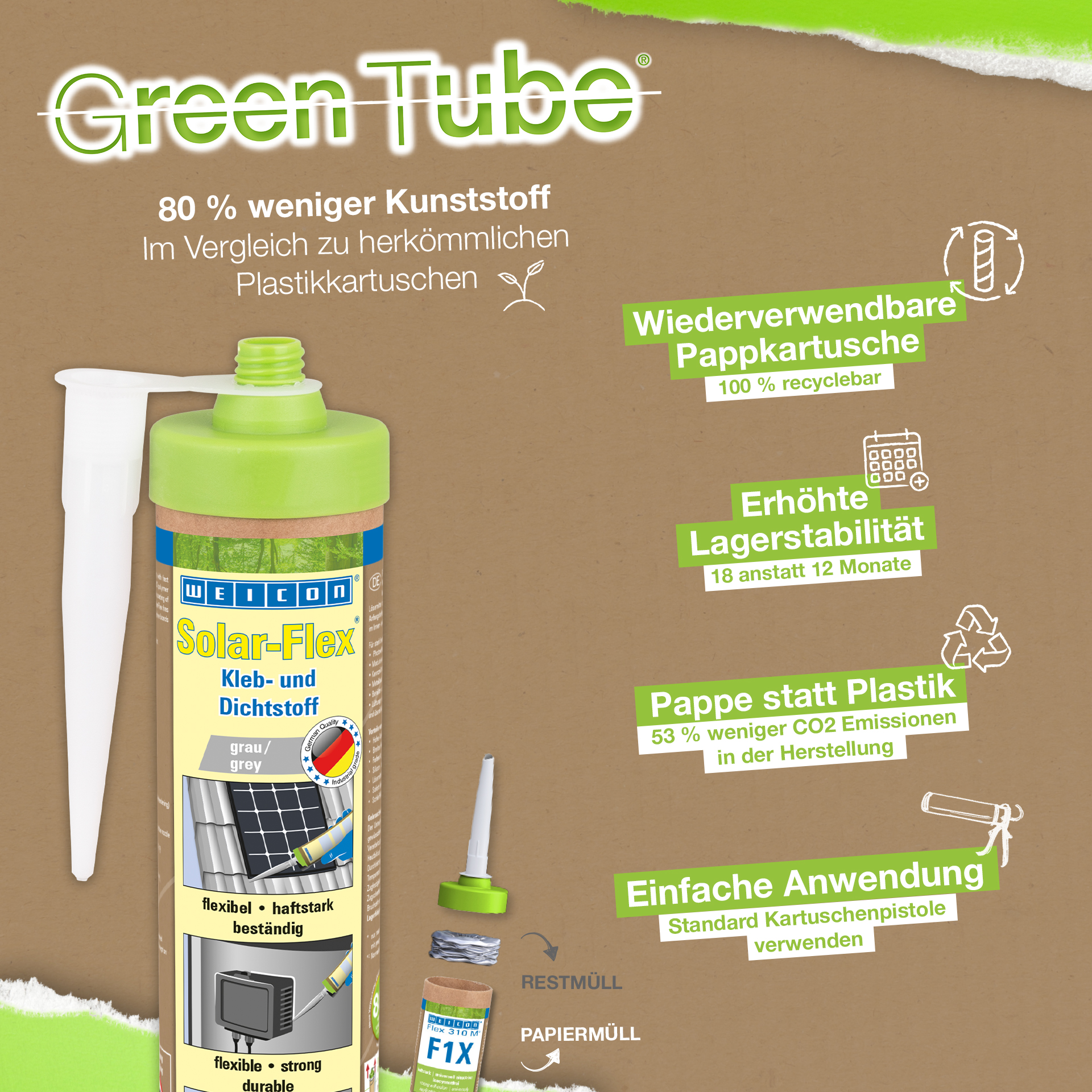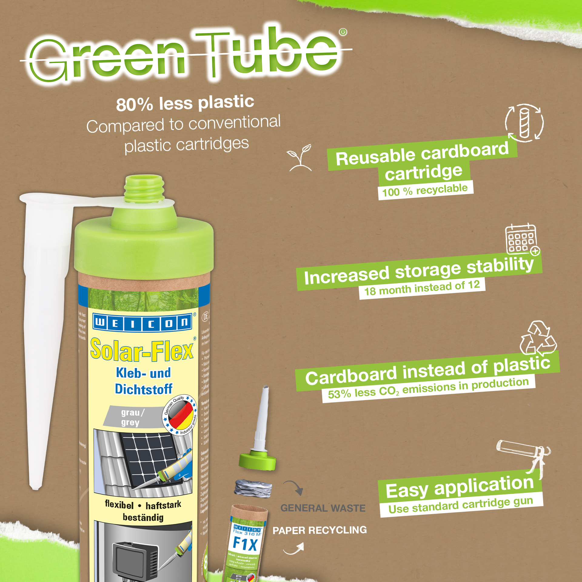 WEICON Solar-Flex ist haftstark, nicht korrosiv, „nass in nass“ überlackierbar, witterungsbeständig, UV-beständig und silicon-, isocyanat-, halogen- und lösemittelfrei. Solar-Flex ist ein elastischer Klebstoff auf MS-Polymer-Basis speziell für die Solarindustrie. Die sehr hohe Anfangshaftung und der schnelle Klebkraftaufbau ermöglichen Verklebungen auch an senkrechten Flächen. Ersetzt herkömmliche Befestigungsmethoden bei der Montage von Solar- und Photovoltaikanlagen.