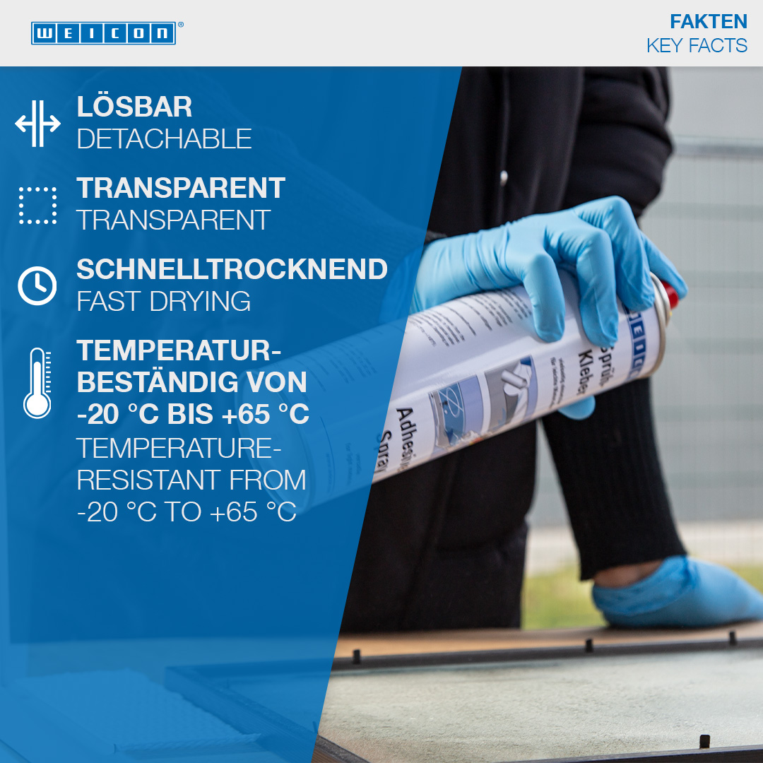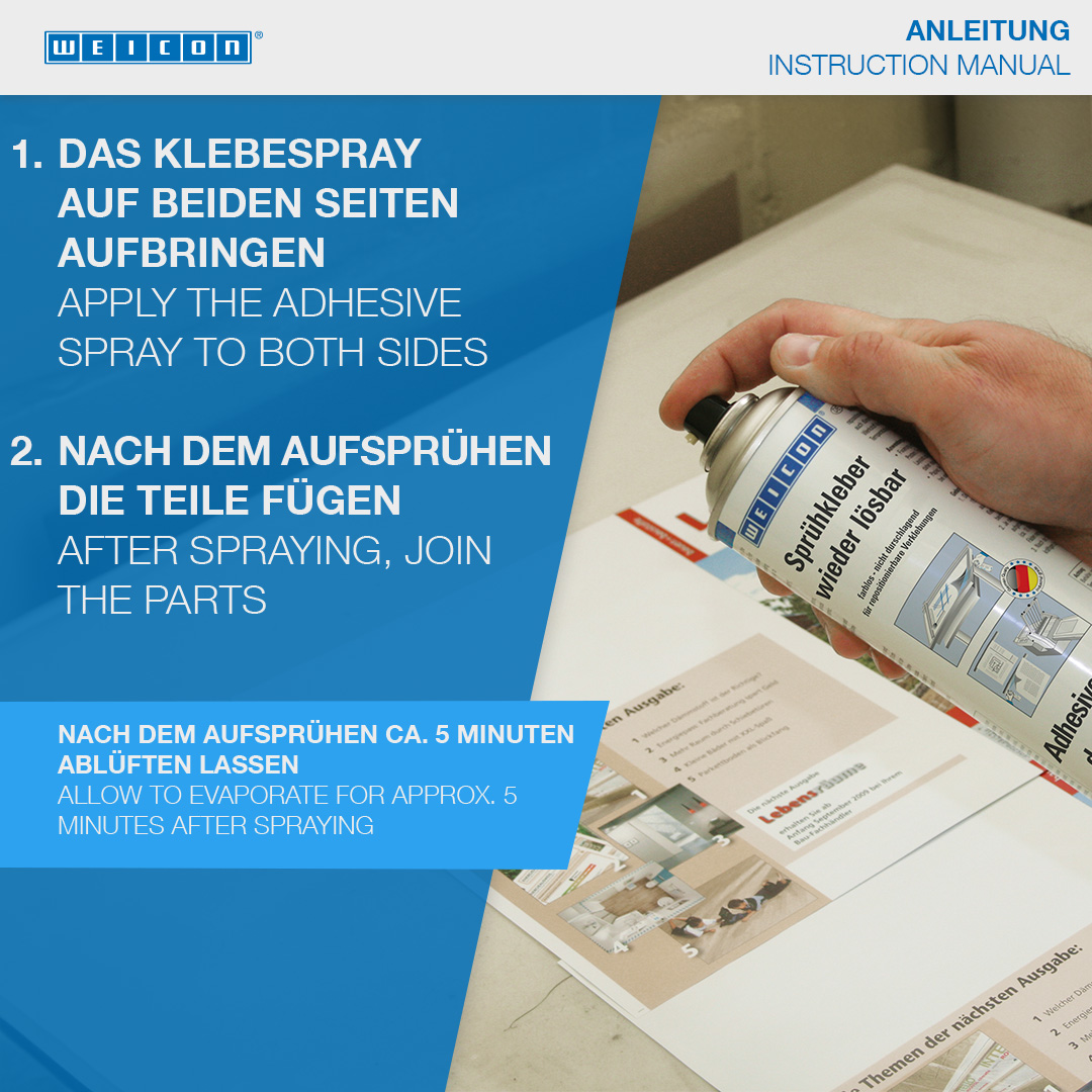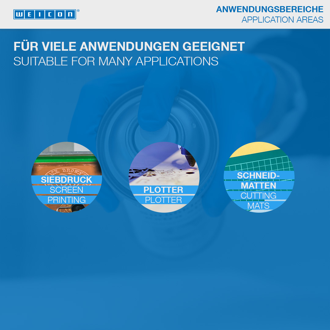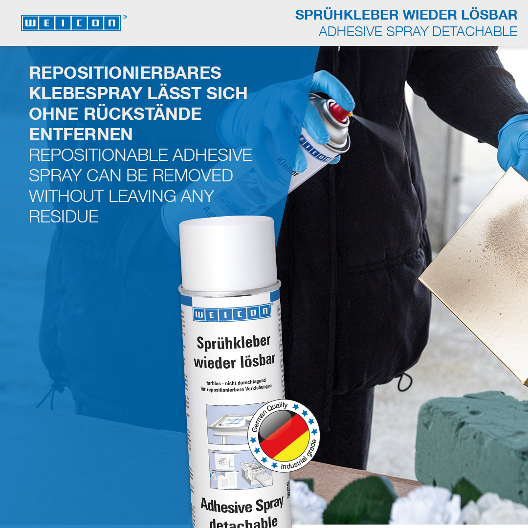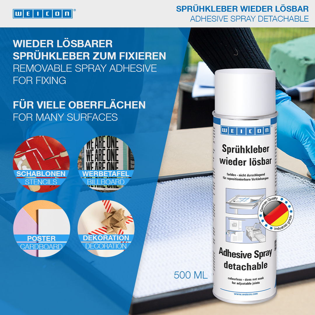 WEICON Sprühkleber wieder lösbar ist speziell für wieder ablösbare, repositionierbare Verbindungen geeignet. WEICON Sprühkleber wieder lösbar ist farblos, schlägt nicht durch, verfärbt nicht und verursacht auch bei dünnen Materialien kein „Aufwellen“. Mit Sprühkleber wieder lösbar können Papier, Pappe und Folien mit- und untereinander verklebt werden. Bei einseitigem Auftrag ist die Verbindung wieder lösbar; bei beidseitigem Auftrag ist die Verbindung dauerhaft. WEICON Sprühkleber wieder lösbar kann zur Fixierung von z.B. Schablonen, Werbetafeln, Postern, Fotos, Dekorationen im Messebau, Layouts oder technischen Zeichnungen eingesetzt werden.
