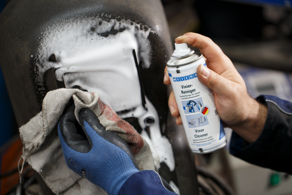 WEICON Visierreiniger ist ein Spezialreiniger für die Reinigung und Pflege von empfindlichen Kunststoff- und Glasoberflächen, ist antistatisch und antireflektierend, vermindert Blendeffekte und verbessert die Sicht. Entfernt Verunreinigungen durch Insekten, Schmutz, Staub, Fett und Nikotin schonend und streifenfrei. WEICON Visierreiniger kann an Visieren aller Art, Schweißmasken und Schweißschutzbrillen, Sichtschutz- und Sicherheitsgläsern, Kunststoffgehäusen an CNC-Maschinen, Druckern, Scannern, etc. und an allen anderen Kunststoff- und Glasoberflächen eingesetzt werden.