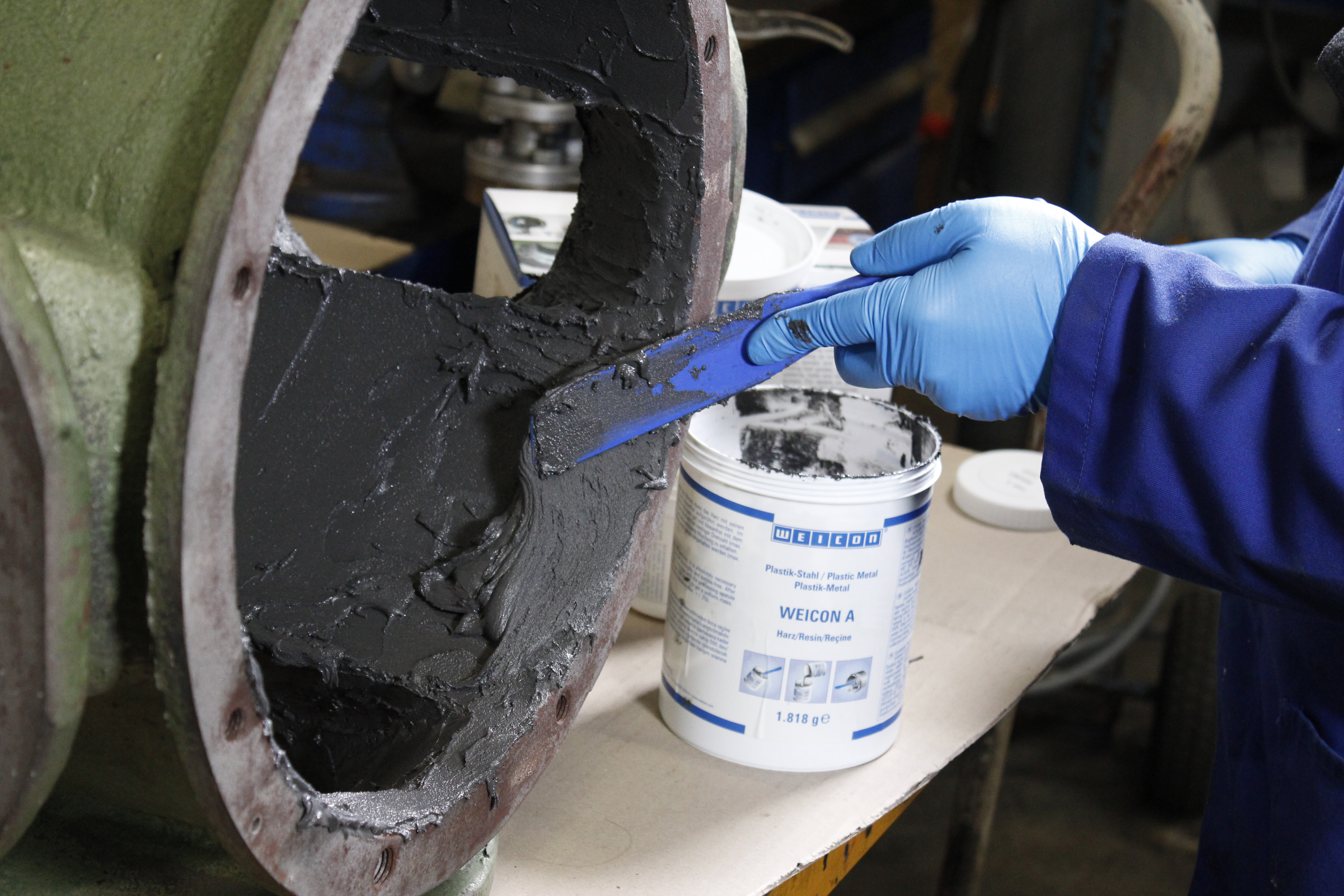WEICON A verfügt über ein DNV-Zertifikat und eignet sich insbesondere für Reparatur- und Instandsetzungsarbeiten in der maritimen Industrie. Das Epoxidharz-System ist mit Stahlpigmenten hochgefüllt, magnetisch und so pastös, dass es selbst an senkrechten Flächen verarbeitet werden kann. Es kann zur Beseitigung von Korrosionsschäden und Lochfraß oder zur Ausbesserung von Löchern und Lunkern verwendet werden. Beispielsweise kann es zur Reproduktion von schweren Stahlbauteilen genutzt werden, die starke Schäden durch Korrosion und Lochfraß aufweisen. Dabei stellt WEICON A eine echte Alternative zum Auftragsschweißen dar, da es bei der Verarbeitung des Epoxidharzes nicht zu einem Wärmeverzug wie beim Schweißen kommt. Das 2-Komponenten-System kann für Reparaturen an Tanks und Rohren sowie für Ausbesserungen von Rissen an Motor- oder Pumpengehäusen und Maschinenteilen zum Einsatz kommen. Es eignet sich ideal für den Einsatz in Abwassersystemen, wo Rohre und Leitungen starken Medieneinflüssen ausgesetzt sind. Weitere Anwendungsbeispiele sind die Herstellung von Modellen, Formen, Werkzeugen und Spannvorrichtungen. WEICON A kann im Maschinenbau, im Werkzeugbau, in der Zementindustrie, in Kraftwerken, im Modell und Formenbau sowie in vielen weiteren industriellen Bereichen eingesetzt werden.