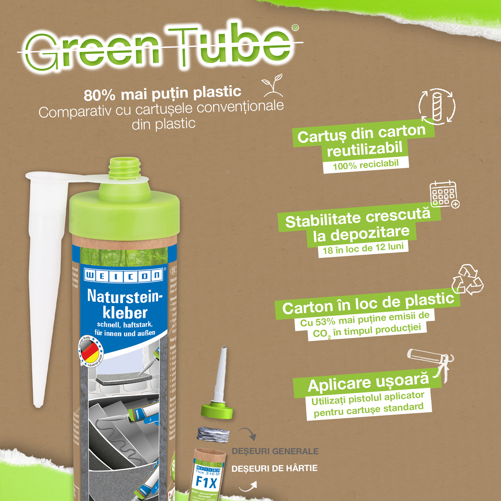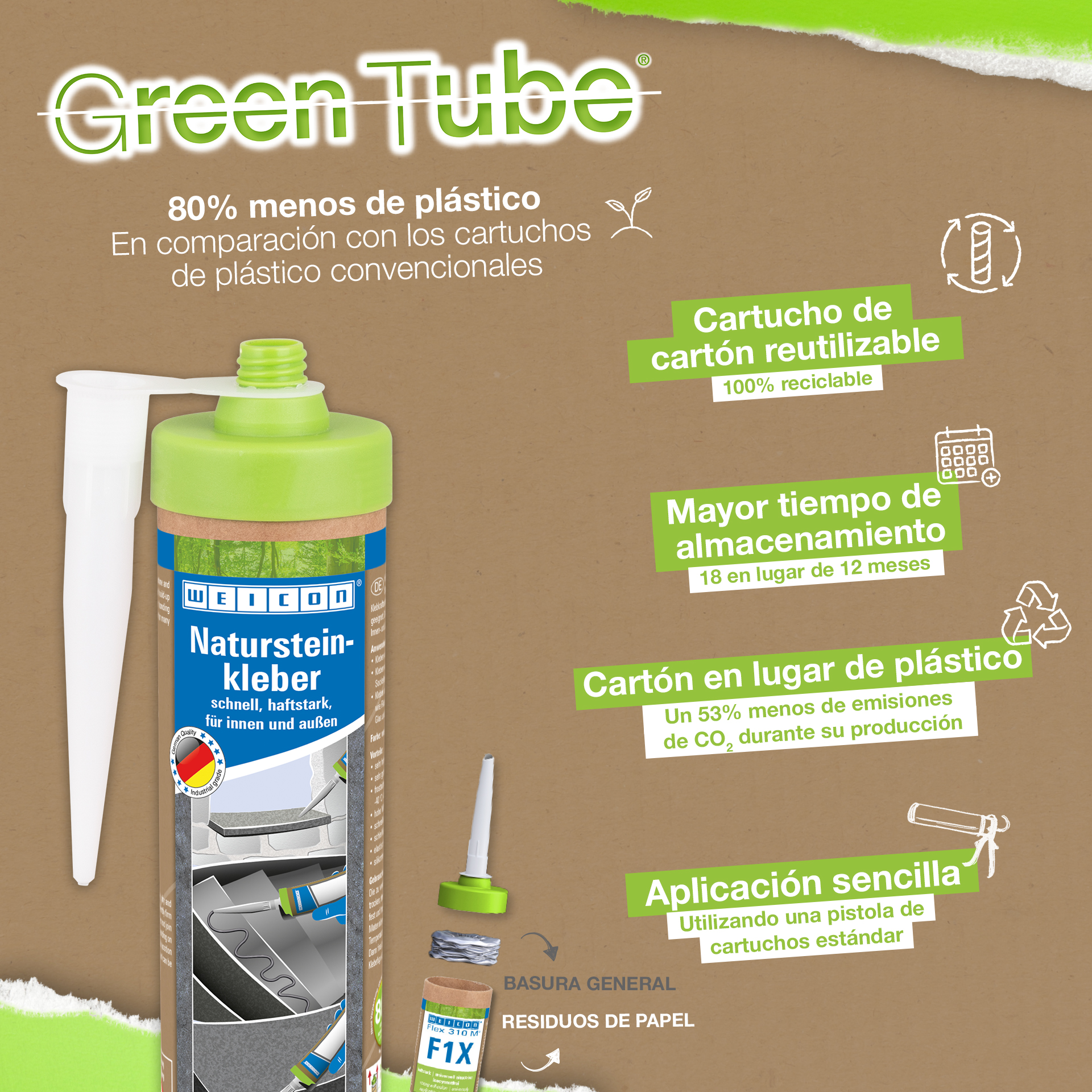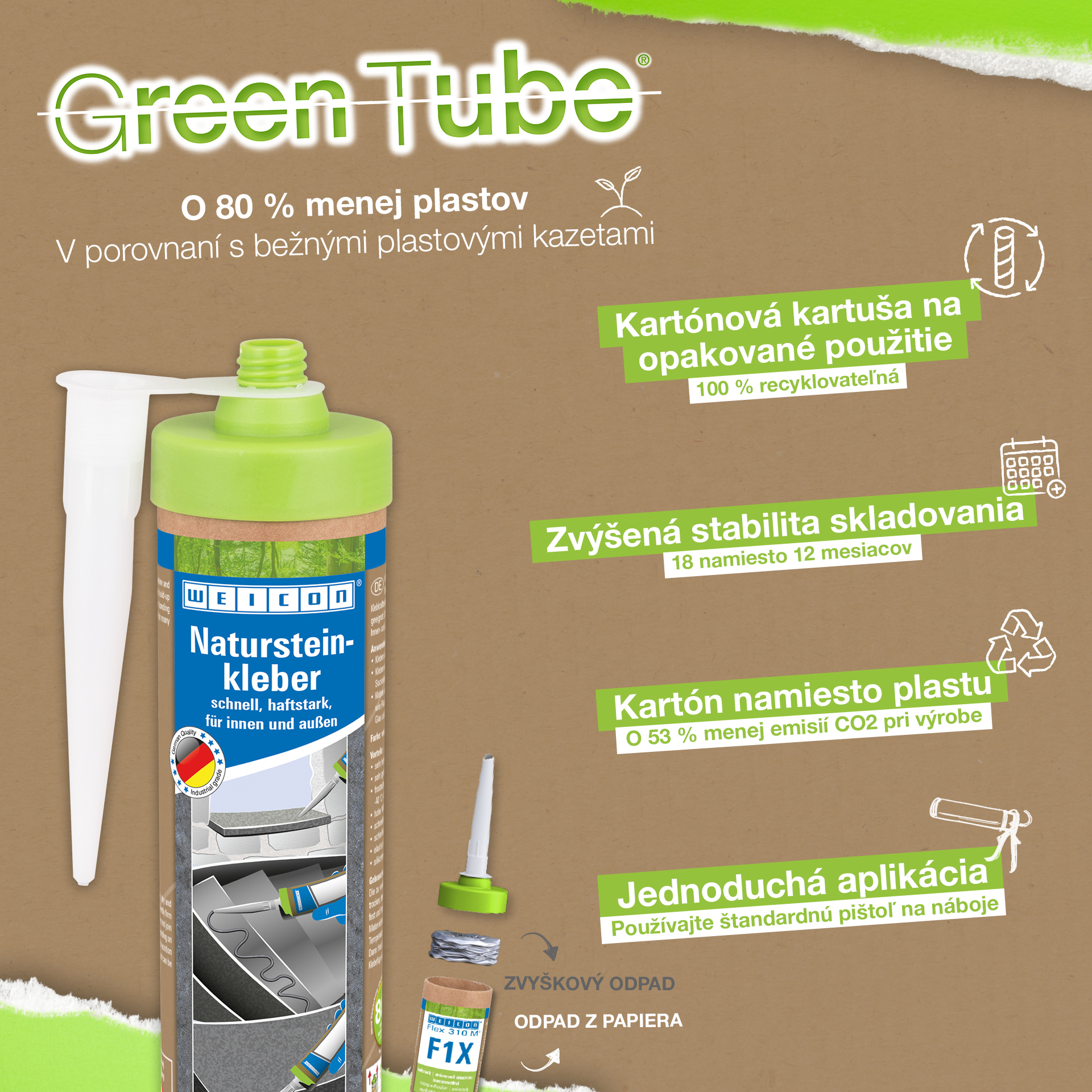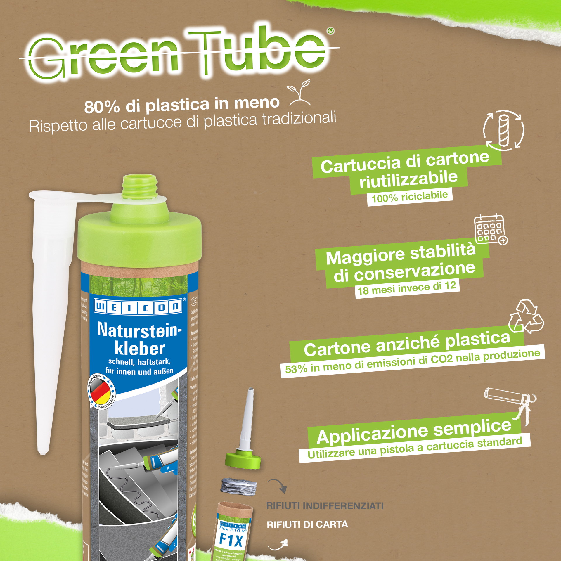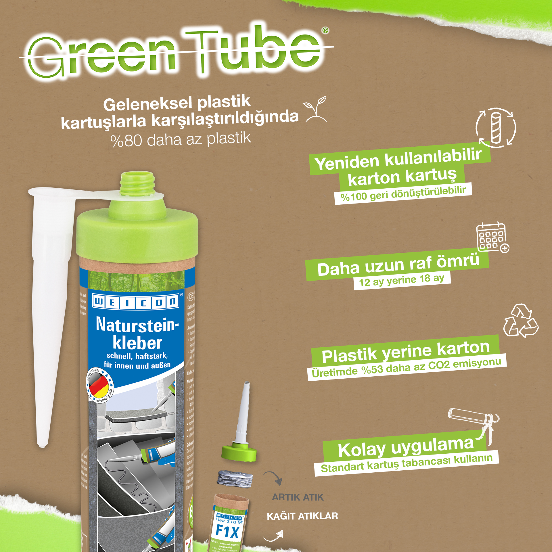 WEICON Natursteinkleber ist ein haftstarker Klebstoff für die Montage von Naturstein, Stein und Keramik. Durch seine sehr hohe Anfangshaftung und den schnellen Klebkraftaufbau sind Verklebungen selbst an senkrechten Flächen, wie Wänden, möglich. Der Steinkleber eignet sich für viele Anwendungen im Innen- und Außenbereich. Er ist frostsicher, hat eine hohe Temperaturbeständigkeit von -40 °C bis +90 °C sowie eine hohe Witterungs- und UV-Beständigkeit. Der Natursteinkleber härtet schnell aus und hat eine sehr hohe Endfestigkeit. Nach der Aushärtung ist der Klebstoff schleiffähig und bleibt elastisch, um so Bewegungen auszugleichen. Der Steinkleber ist silikonfrei, isocyanatfrei, halogenfrei und lösemittelfrei. Er kann in den verschiedensten Anwendungen eingesetzt werden – sei es beim Verkleben von Fensterbänken, Fliesen, Fußbodenleisten, Sockelleisten, Zierleisten oder Treppenstufen. WEICON Natursteinkleber haftet sehr gut auf den unterschiedlichsten Materialien, wie Holz, Holzwerkstoffen, Kunststoffen, Metallen, Glas und mineralischen Untergründen. Er ist in den Farben grau und weiß verfügbar.