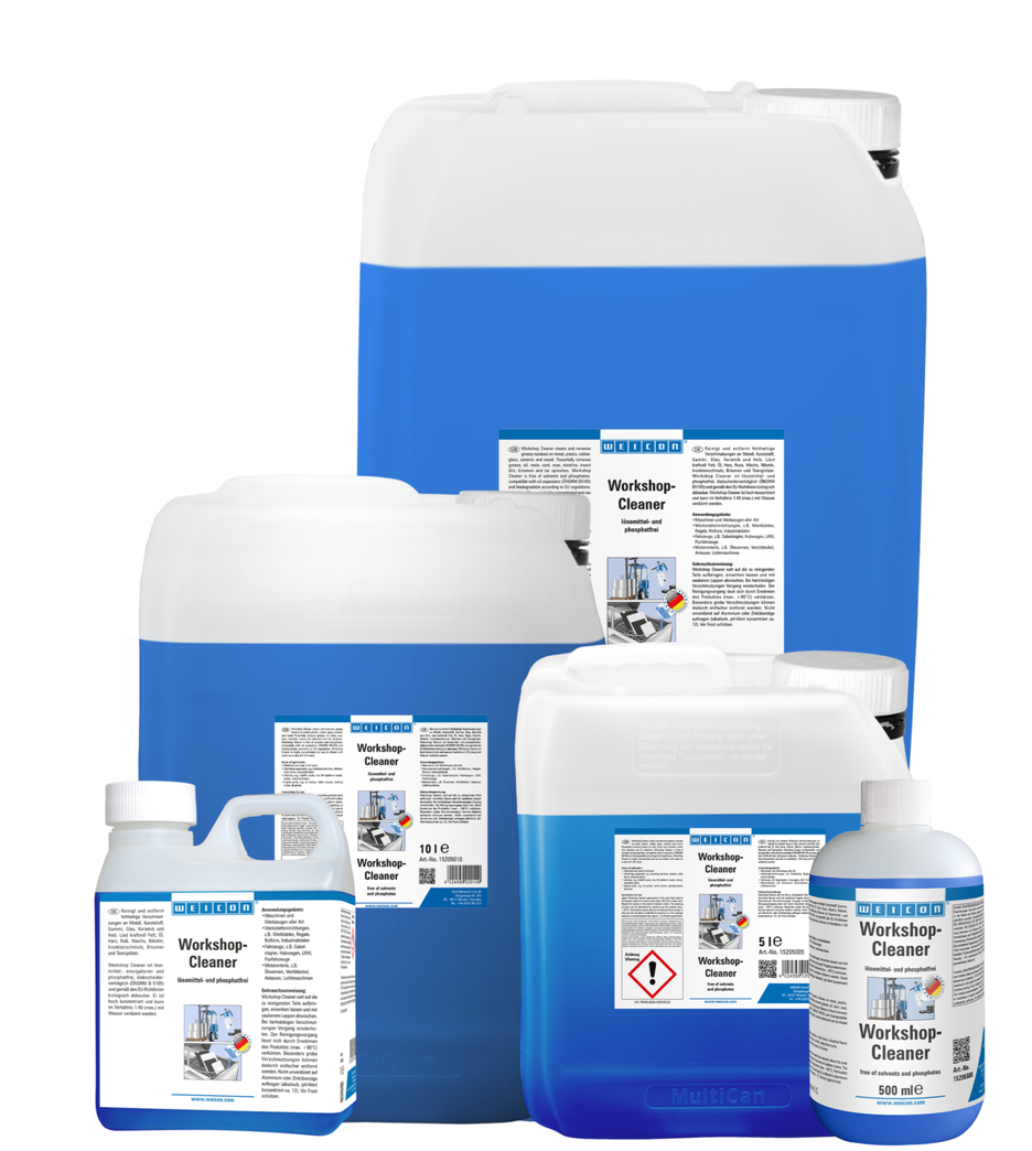 WEICON Workshop Cleaner reinigt und entfettet alle Metalle, Kunststoffe, Gummis, Glas, Keramik und Holz. Löst kraftvoll Fett, Öl, Harz, Ruß, Wachs, Nikotin, Insektenschmutz, Bitumen und Teerspritzer. Workshop Cleaner ist lösemittel-, emulgatoren- und phosphatfrei, ölabscheiderverträglich (ÖNORM B 5105) und gemäß den EU-Richtlinien biologisch abbaubar. Er ist hoch konzentriert und kann im Verhältnis 1:40 (max.) mit Wasser verdünnt werden. Er enthält ausgewählte schaumarme Tenside und kann neben der manuellen Reinigung auch in Hochdruckreinigern, Teilewaschmaschinen und Sprühgeräten (z.B. Pumpsprüher WPS 1500) eingesetzt werden.
