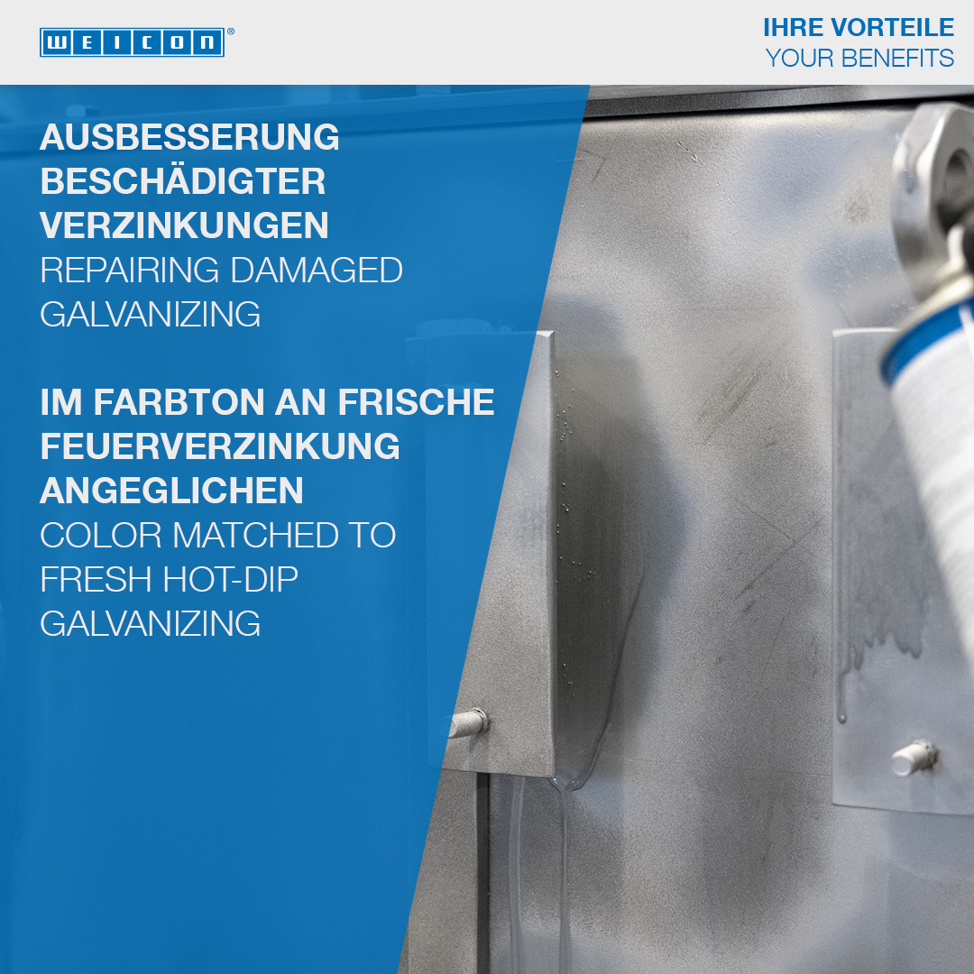 WEICON Zink-Spray ist TÜV-geprüft und verleiht dauerhaft allen Metalloberflächen einen kathodischen Korrosionsschutz. Es bildet eine schnelltrocknende, festhaftende Schutzschicht aus mikrofeinen Zinkflakes. Im Salzsprühnebeltest gemäß DIN EN ISO 9227 zeigten Metallteile, die mit WEICON Zink-Spray beschichtet wurden, auch nach mehr als 1050 Stunden keinerlei Korrosion. Die Zinkflakes bilden eine widerstandsfähige Schutzschicht auch gegen extreme Witterungs- und Umwelteinflüsse. Dadurch erfüllt WEICON Zink-Spray höhere Anforderungen als in der DIN EN ISO 1461 gefordert. WEICON Zink-Spray kann als hochwertige Rostschutzgrundierung, zum Beschichten von Schweiß- und Bohrstellen, als leitende Zwischenschicht beim Punktschweißen und überall dort, wo Metall vor Korrosion geschützt werden muss, eingesetzt werden.