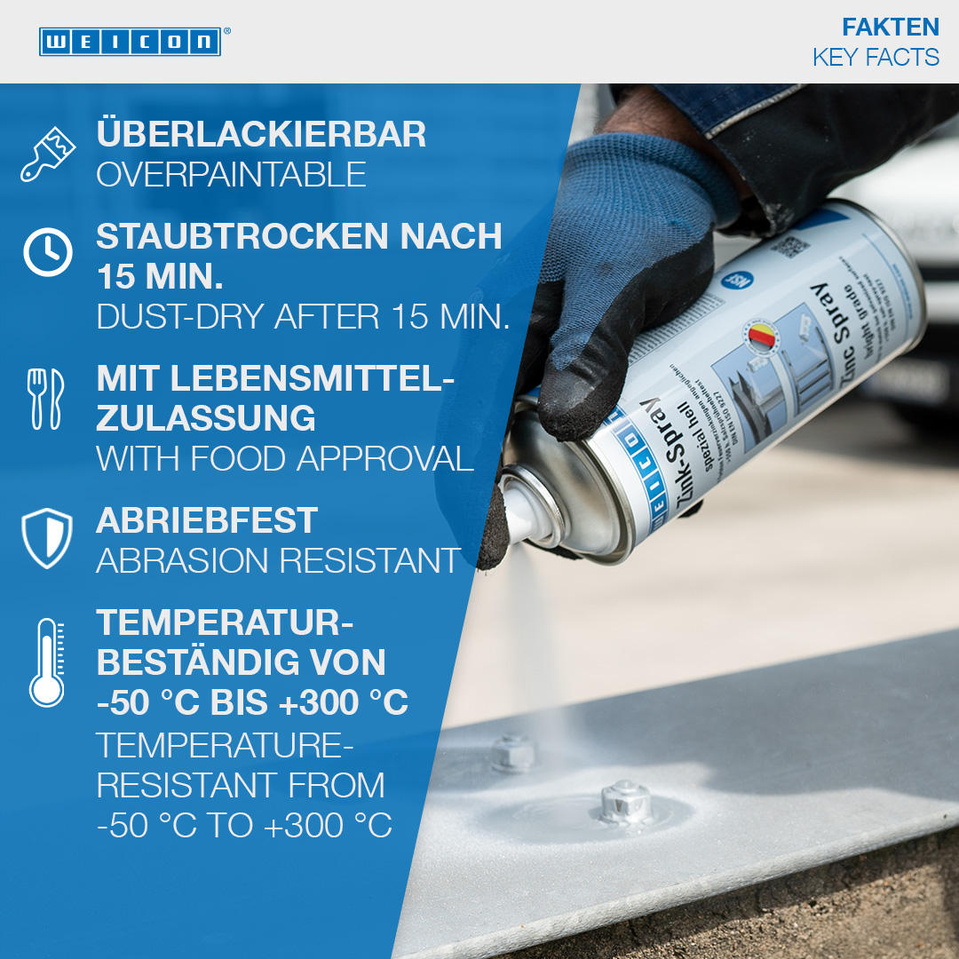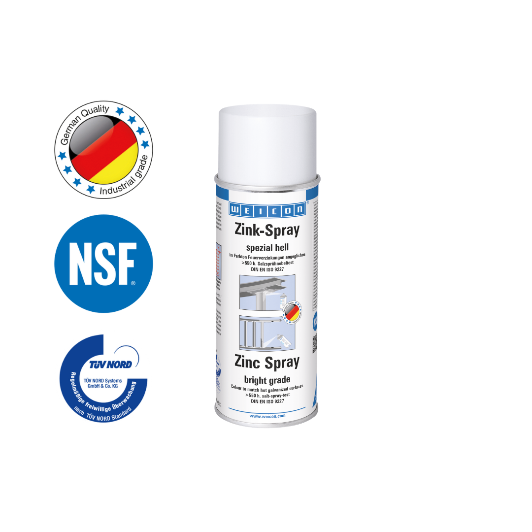 WEICON Zink-Spray spezial hell ist TÜV-geprüft, verleiht dauerhaft allen Metalloberflächen einen kathodischen Korrosionsschutz und hat einen hellen Farbton, der einer frischen Feuerverzinkung angeglichen ist. Es bildet eine schnelltrocknende, festhaftende Schutzschicht aus mikrofeinen Zinkflakes. Die Zinkflakes bilden eine widerstandsfähige Schutzschicht auch gegen extreme Witterungs- und Umwelteinflüsse. Im Salzsprühtest gemäß DIN EN ISO 9227 zeigten Metallteile, die mit Zink-Spray spezial hell beschichtet wurden, auch nach mehr als 550 Stunden keinerlei Korrosion. WEICON Zink-Spray spezial hell kann zum Beschichten von Schweiß- und Bohrstellen, als leitende Zwischenschicht beim Punktschweißen und überall dort, wo Metall vor Korrosion geschützt werden muss, eingesetzt werden.